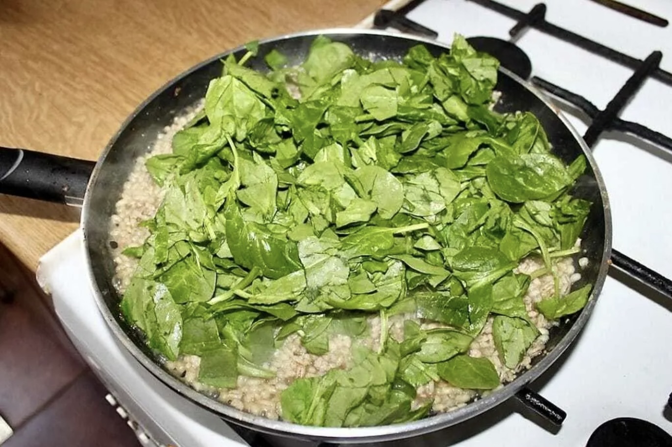 Szpinak: Po upływie około 25 minut, gdy kasza będzie już dość miękka (pamiętaj, że pęczak nigdy nie jest super miękki), wrzuć na patelnię dobrze oczyszczony i pokrojony szpinak.