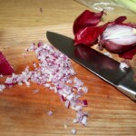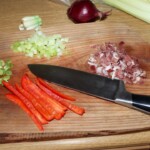 Przygotowanie warzyw i szynki: Szynkę szwarcwaldzką, czerwoną cebulę, paprykę, seler naciowy, dymkę i chilli pokrój w drobną kostkę.