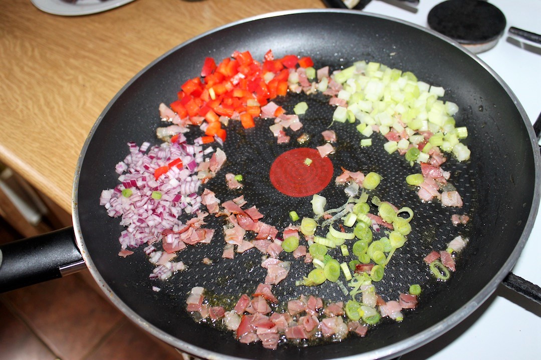 Smażenie szynki i warzyw: Na patelni rozgrzej niewielką ilość tłuszczu. Wrzuć szynkę, a następnie smaż 2 minuty, aż się zrumieni. Następnie dodaj pokrojone warzywa i smaż na średnim ogniu przez 2-3 minuty, mieszając, aż nieco zmiękną.