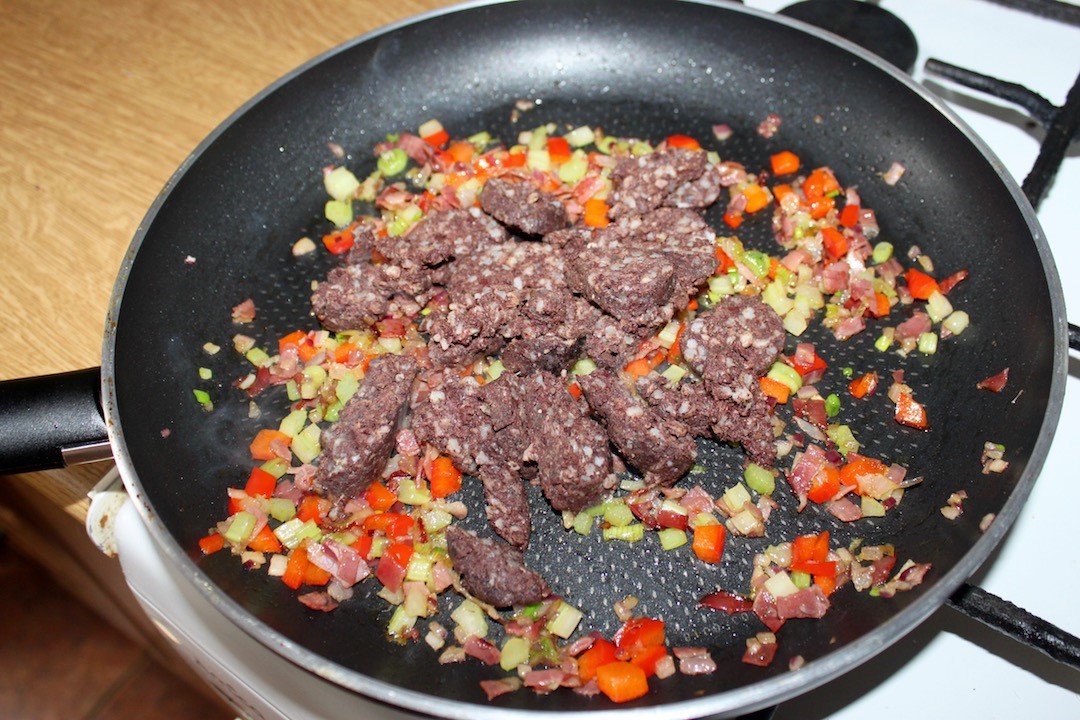 Dodanie kaszanki: Zdejmij skórkę z kaszanki, a następnie pokrój ją na małe plasterki. Wrzuć na patelnię i rozgnieć widelcem. Smaż 2-3 minuty.