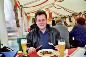 Moja miłość do kiełbasek norymberskich narodziła się w roku 1995 podczas jednej z moich pierwszych wizyt w Norymberdze. To wielki nietakt, potwarz wręcz dla lokalsów odmówić im spróbowania kiełbasek, więc zrobić tego nie mogłem. Na szczęście, bo zakochałem się (jak mnóstwo osób z całego świata) w ich smaku i dymnym aromacie. Ta miłość trwa do dzisiaj. Zresztą, czy na zdjęciu poniżej mój uśmiech podczas konsumowania kiełbasek nie jest oznaką szczęścia? Kiełbaski norymberskie. Mała rzecz, a cholernie cieszy.