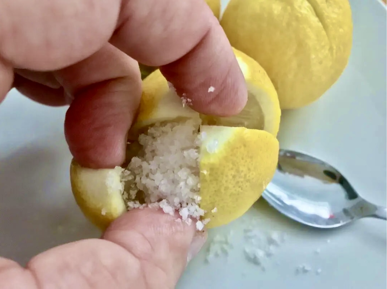 Nacinanie i solenie: Ponacinaj cytryny na krzyż, ale nie do samego końca. Do każdej naciętej cytryny wsyp po dwie łyżeczki drobnej soli.