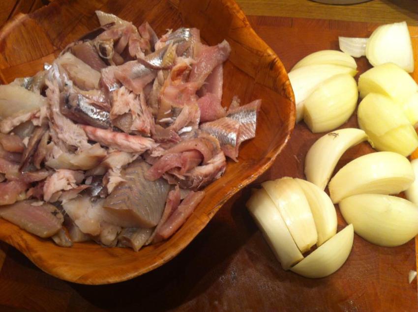 Wszystko (ryby i cebule) zmiel razem w maszynce.