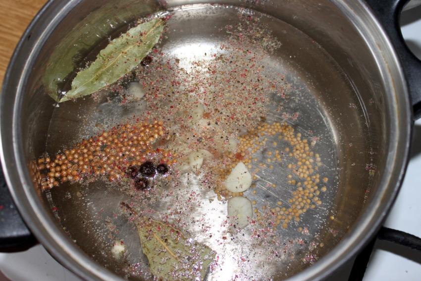 Dodaj pokrojony w plastry czosnek, cukier, ziele angielskie, liść laurowy, sól, pieprz, kolendrę i gorczycę.