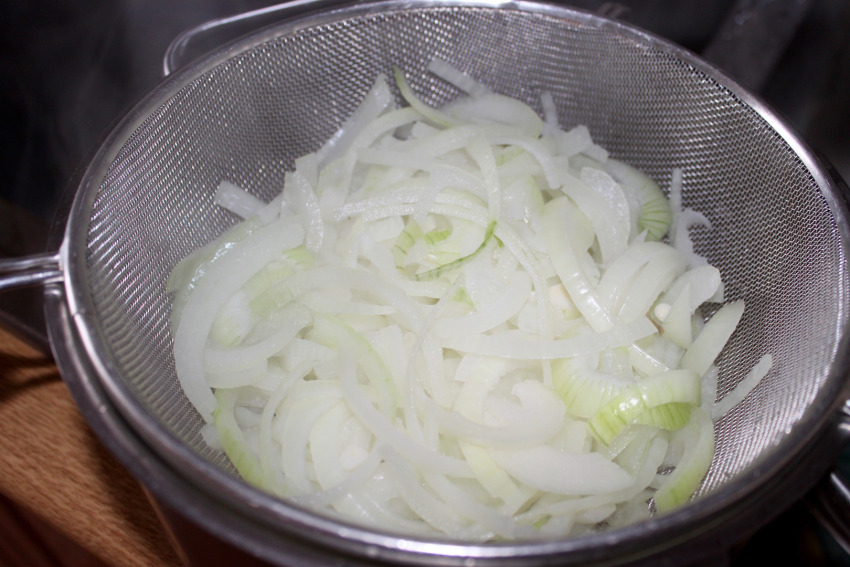 Pokrój dwie cebule w piórka i zalej wrzątkiem, a po minucie odcedź (to je złagodzi).
