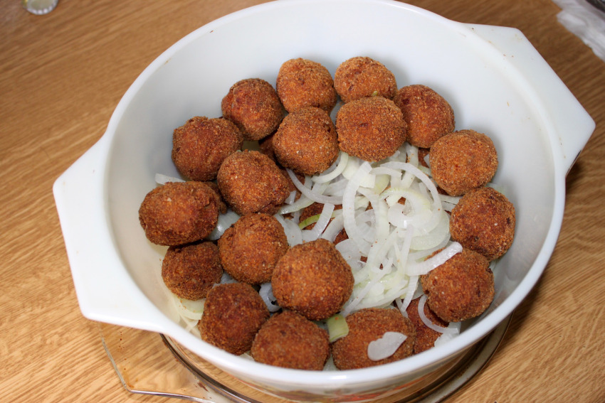 W naczyniu układaj warstwami klopsiki i cebulę.