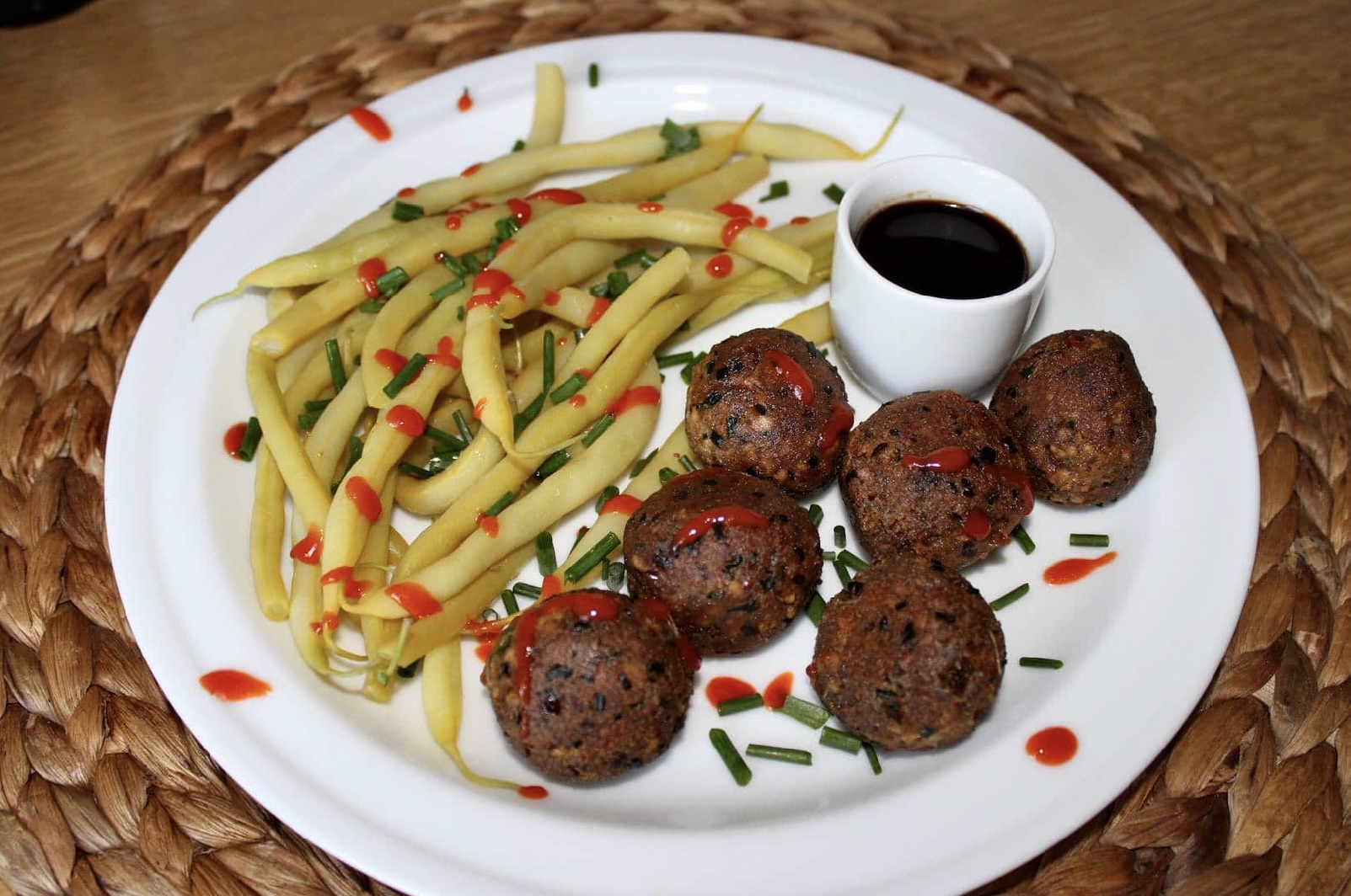 Podawaj klopsiki z fasolką szparagową, posypane dymką lub szczypiorkiem i polane ostrym sosem chili lub sriracha. Całość podaj z sosem sojowym wymieszanym z wasabi.
