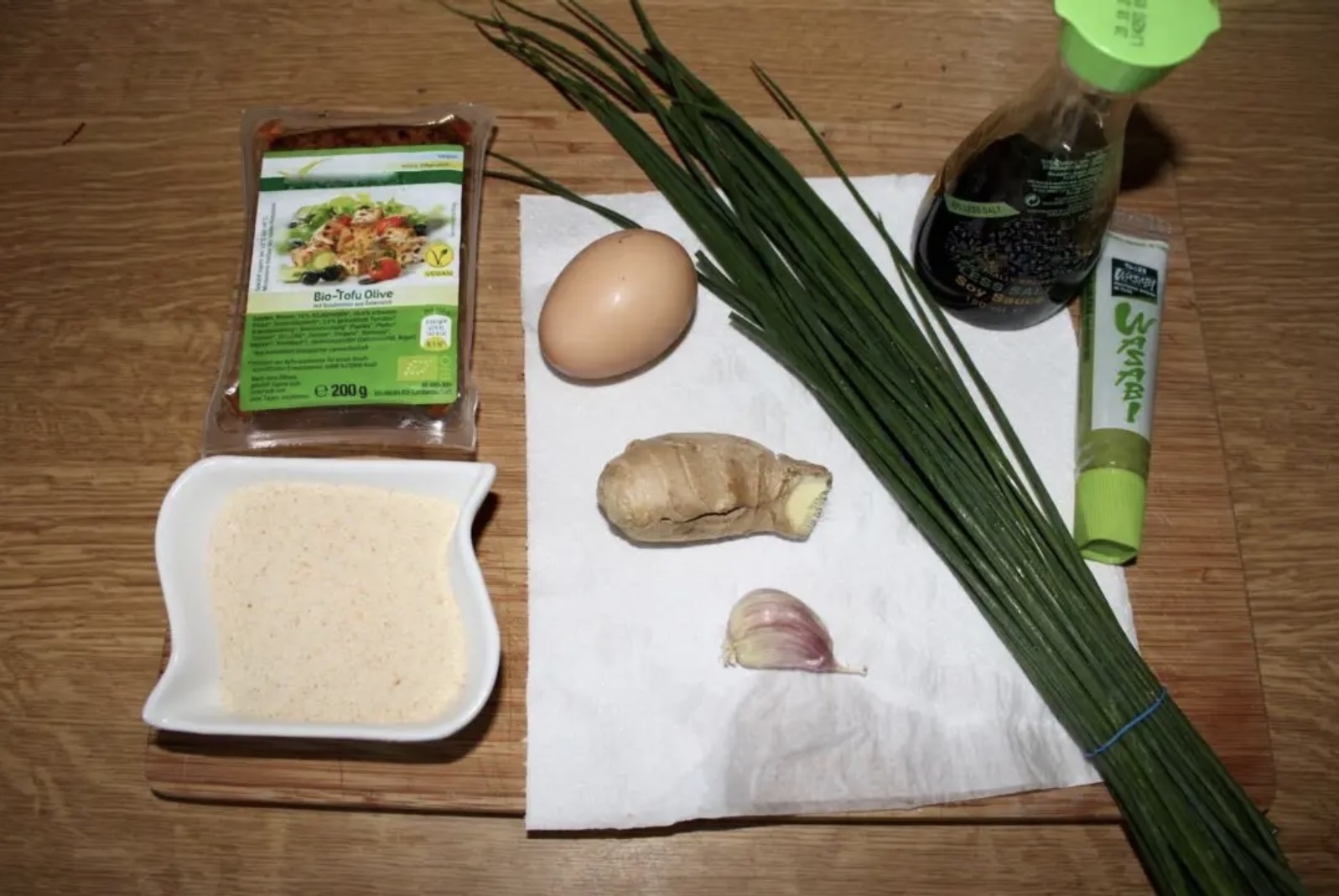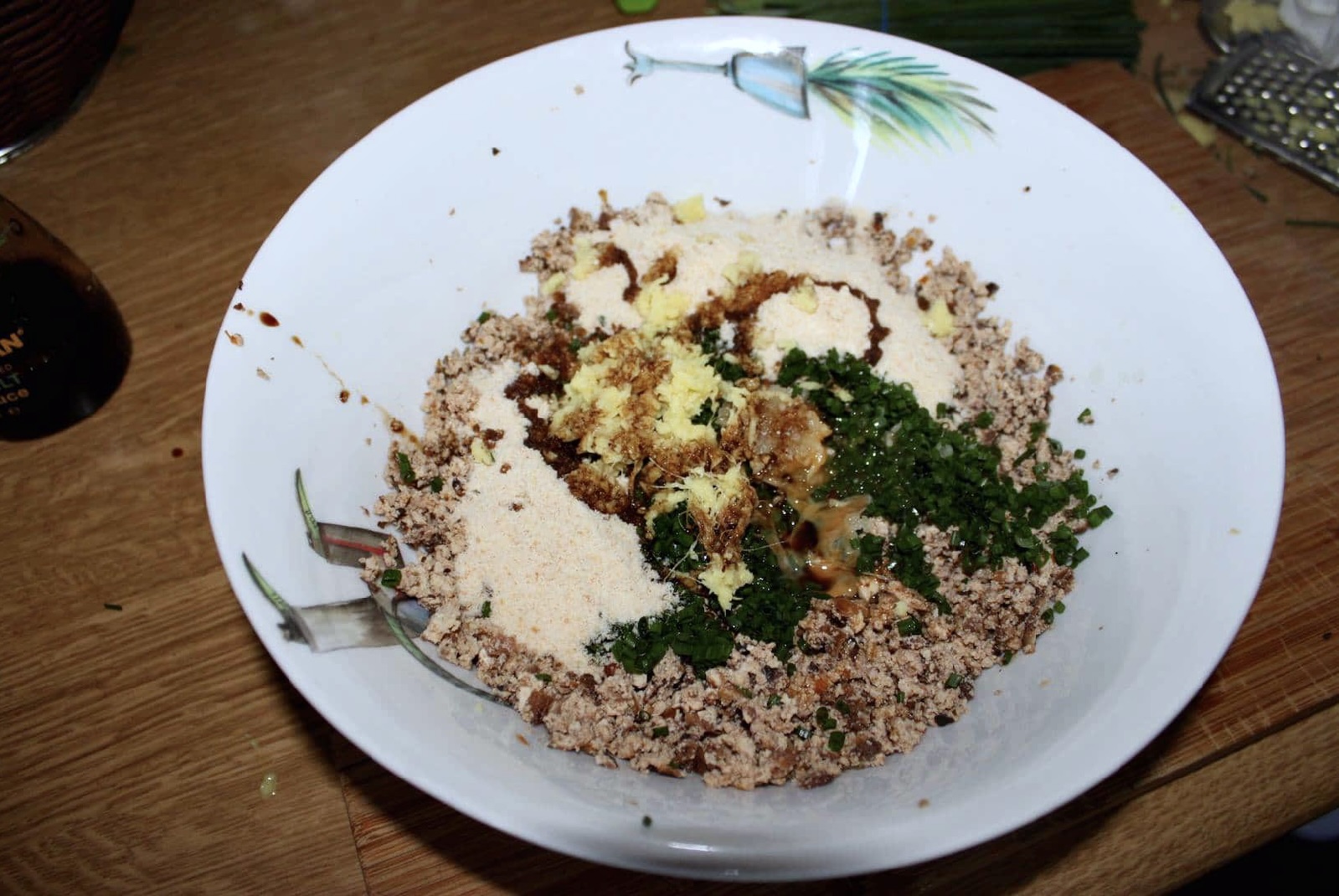 Masa: Do rozgniecionego tofu dodaj posiekany szczypiorek lub dymkę, 3 łyżki bułki tartej, łyżkę startego świeżego imbiru, 3-5 łyżek sosu sojowego, zmiażdżony ząbek czosnku i 1 żółtko jajka.