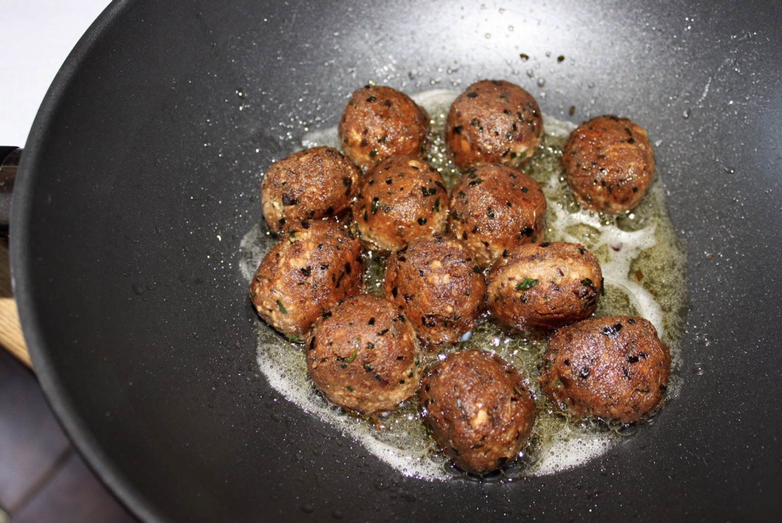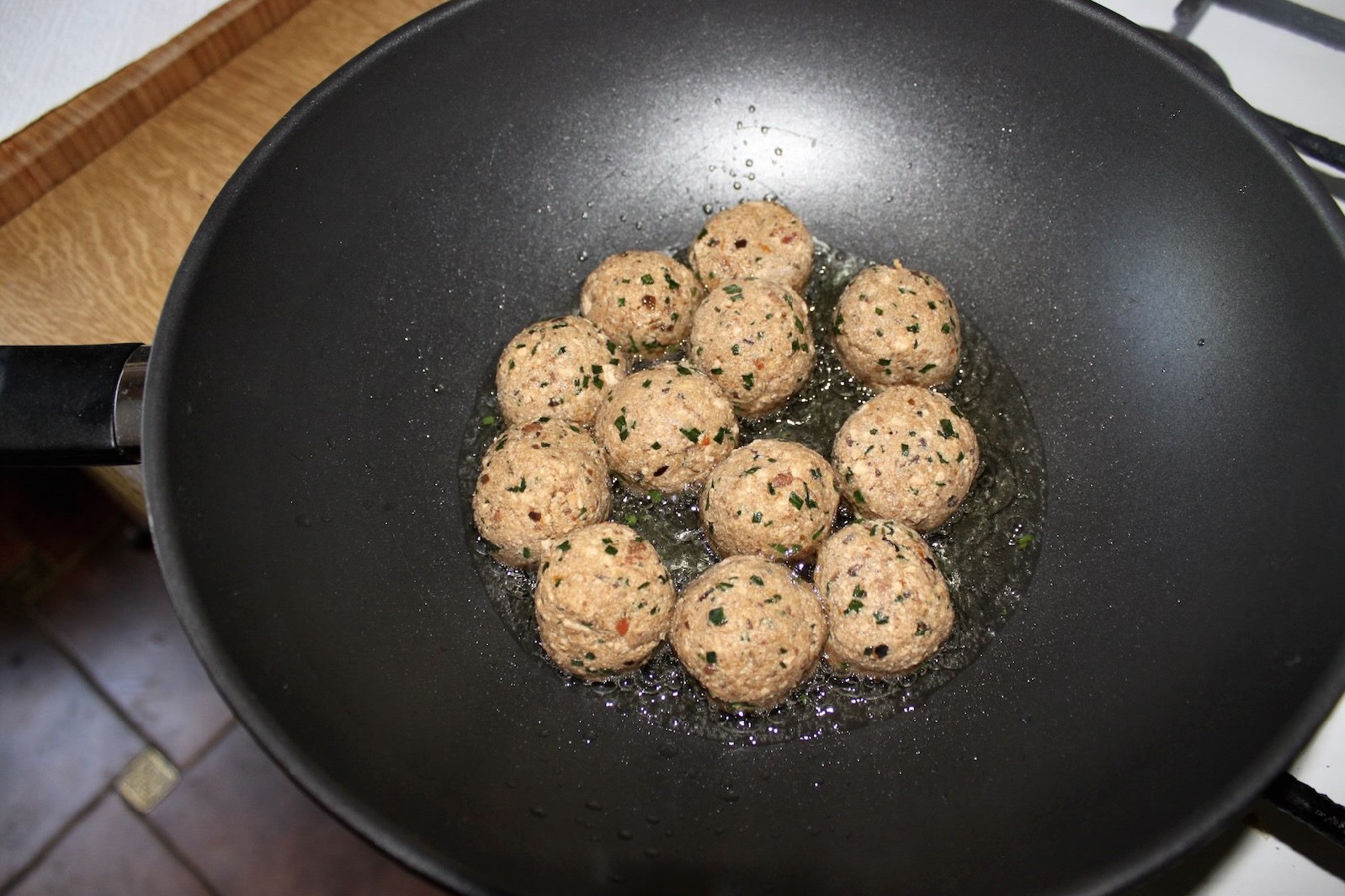 Smażenie: Z masy uformuj kulki wielkości piłek golfowych. Na patelni rozgrzej olej (arachidowy lub roślinny) i smaż klopsiki na średnim ogniu przez około 5 minut, obracając, aby usmażyły się równomiernie.