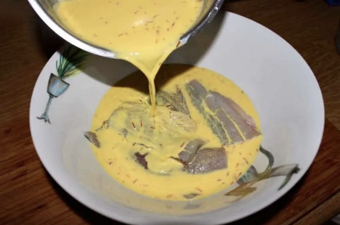 Wyfiletuj rybę. Filety dobrze umyj, przełóż do miski i zalej przestudzonym mlekiem z szafranem/kurkumą. Przykryj folią spożywczą i odstaw na około godzinę.