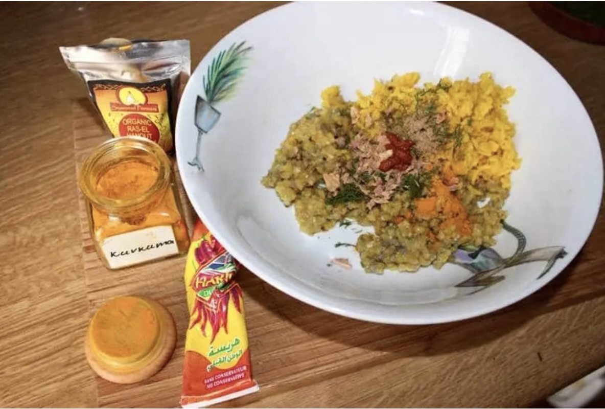 Do zmielonej ryby dodaj przestudzony ryż, pół łyżeczki mielonej kurkumy, łyżeczkę ulubionej przyprawy (np. Ras el hanout), trochę harissy i odrobinę świeżego koperku.