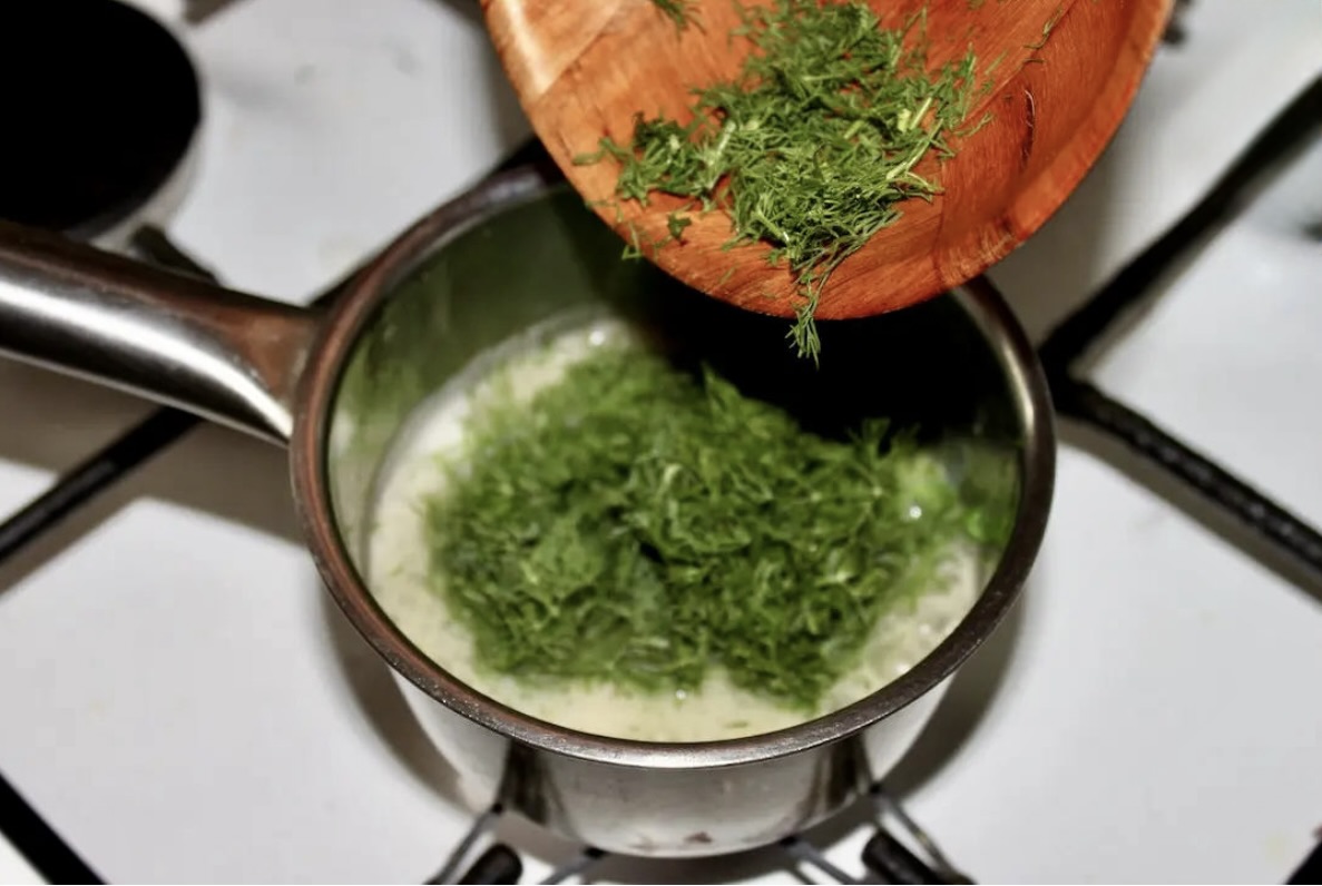 Podczas gdy klopsy się gotują, przygotuj sos koperkowy , który bazuje na wywarze rybnym i śmietanie.