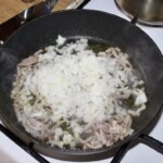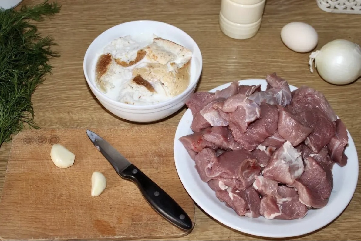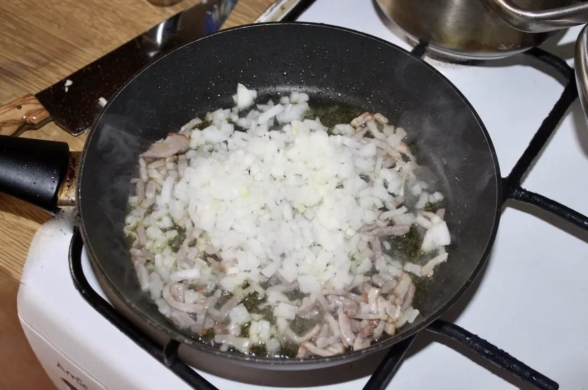 Przygotowanie mięsa: Cebulę i boczek drobno posiekaj i podsmaż na patelni (do zeszklenia cebuli i wytopienia boczku). Mięso zmiel w maszynce razem z odciśniętą bułką i czosnkiem.