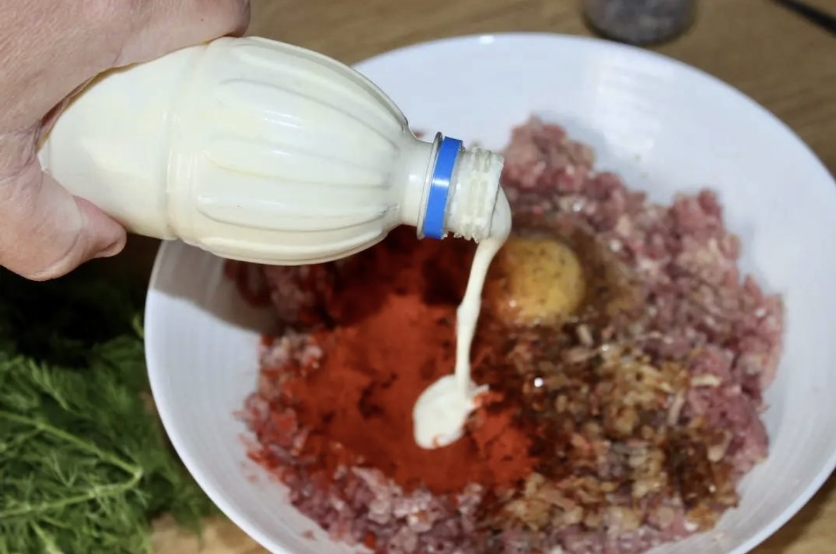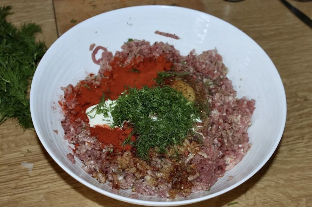 Wyrabianie masy: Do zmielonego mięsa dodaj podsmażony boczek z cebulą, jajko, 100 ml śmietanki, 2 łyżki papryki, sól, pieprz oraz pół pęczka koperku. Wymieszaj na gładką masę.