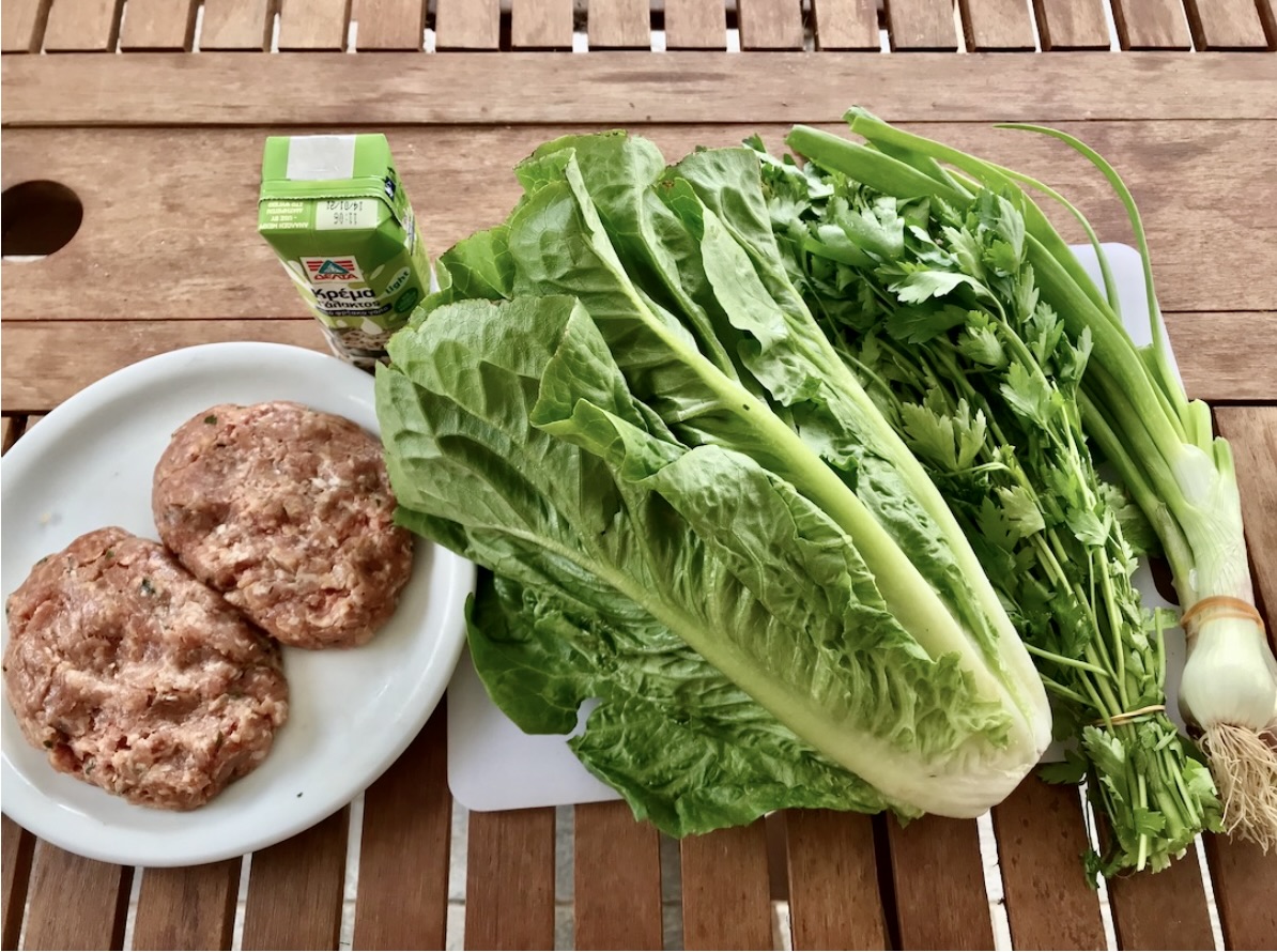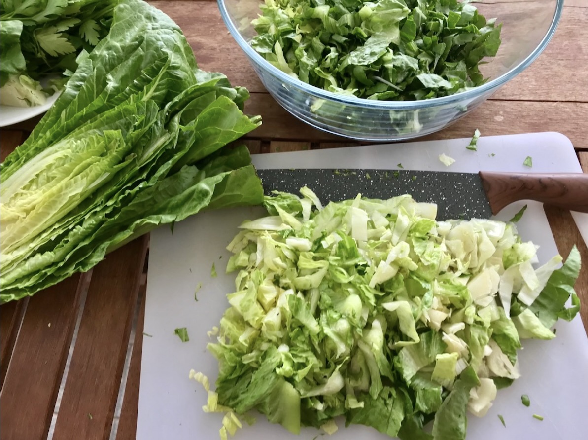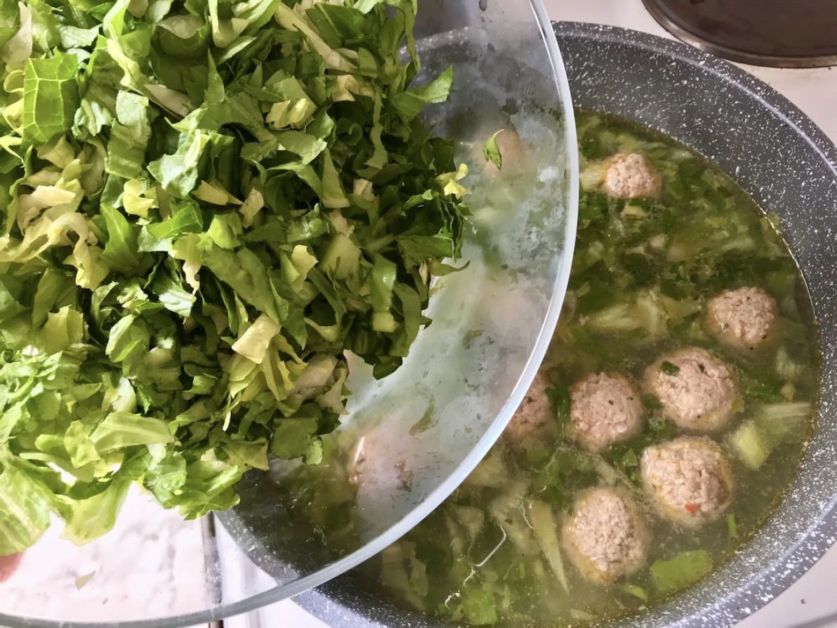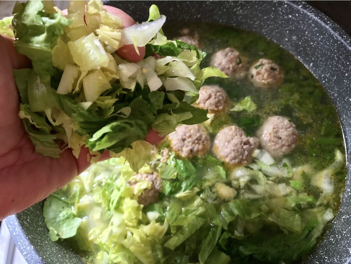 Sałata (twarde części): W międzyczasie pokrój sałatę rzymską. Oddziel twardsze elementy od liści. Po 10 minutach gotowania klopsów, dodaj do garnka twarde części sałaty i gotuj pod przykryciem kolejne 10 minut.