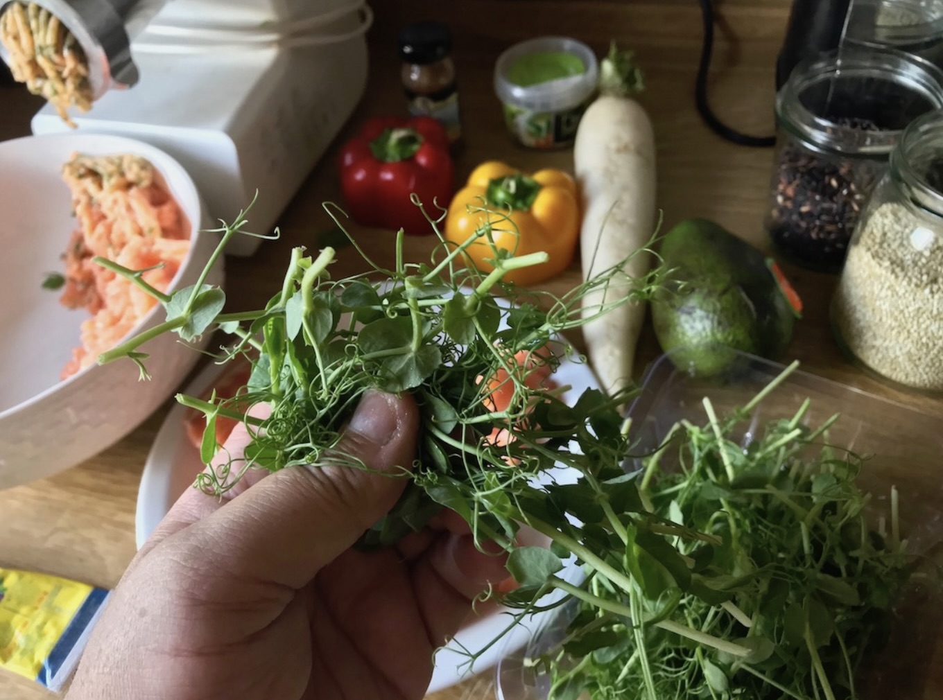 Przygotowanie ziół: Umyj i osusz po garści każdego z ziół (szczaw, kolendra, kiełki groszku; możesz użyć też innych, np. szpinaku, rukoli). Im więcej ziół, tym klopsy będą smaczniejsze.