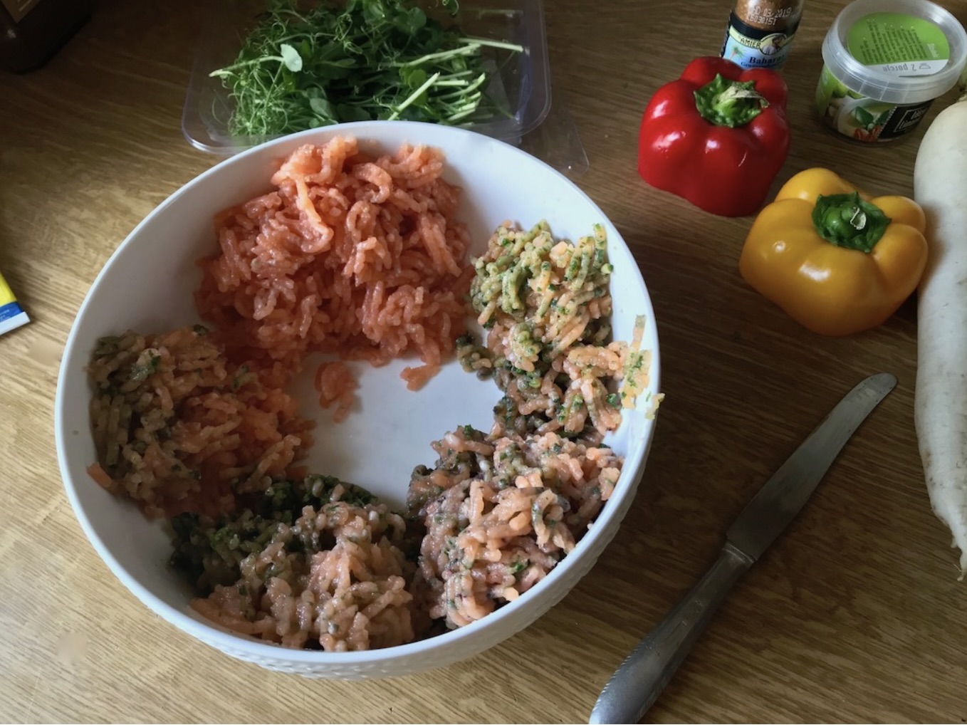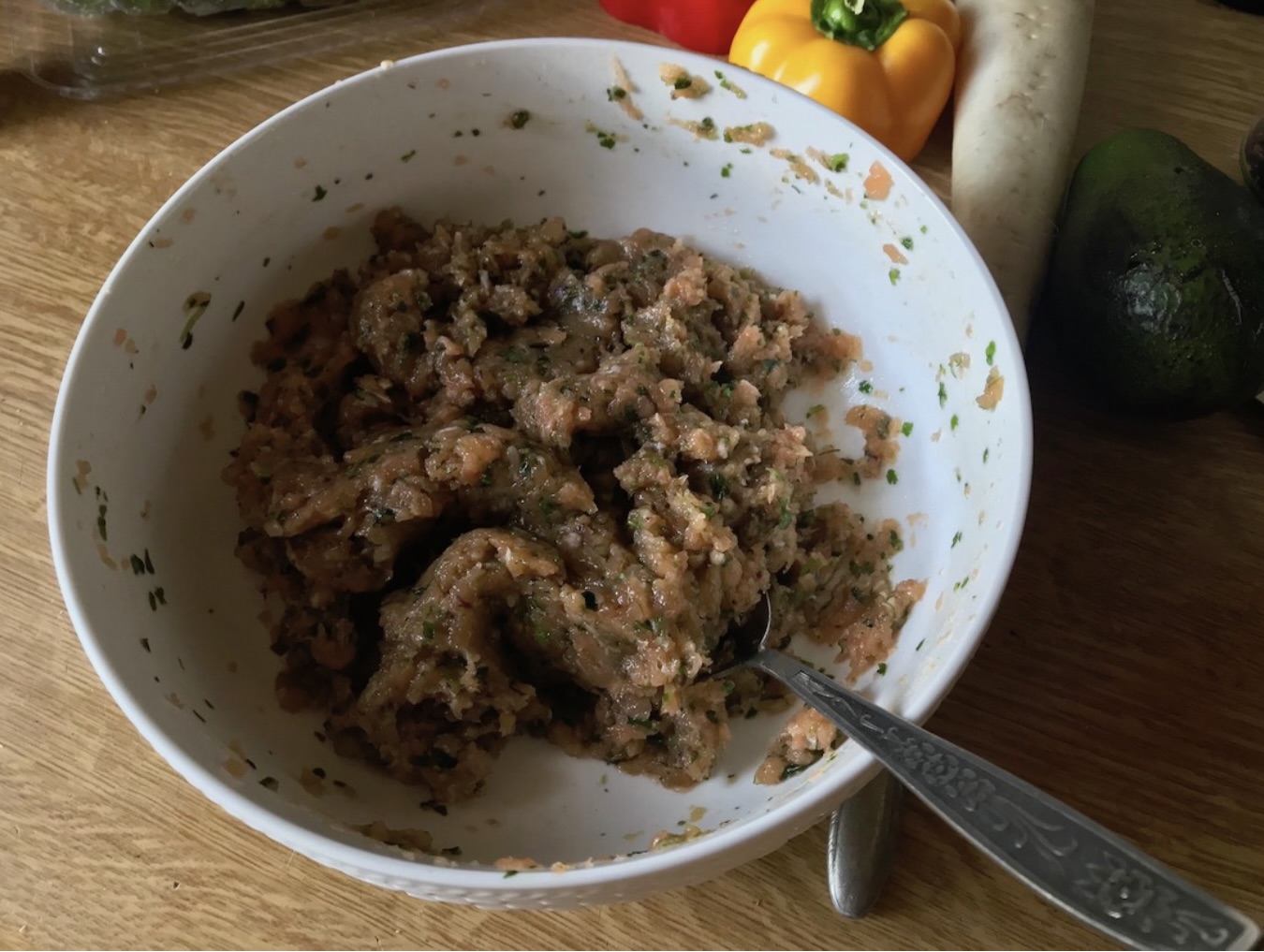 Mielenie i doprawianie: Zmiel łososia wraz z ziołami w maszynce. Zmieloną masę dokładnie wymieszaj. Dodaj suszone liście limonki kaffir (dla cytrynowego posmaku) i ulubioną przyprawę do łososia (np. orientalną baharat lub po prostu sól i pieprz). Bardzo dobrze wymieszaj. Wskazówka: usmaż małego klopsa, aby sprawdzić smak.