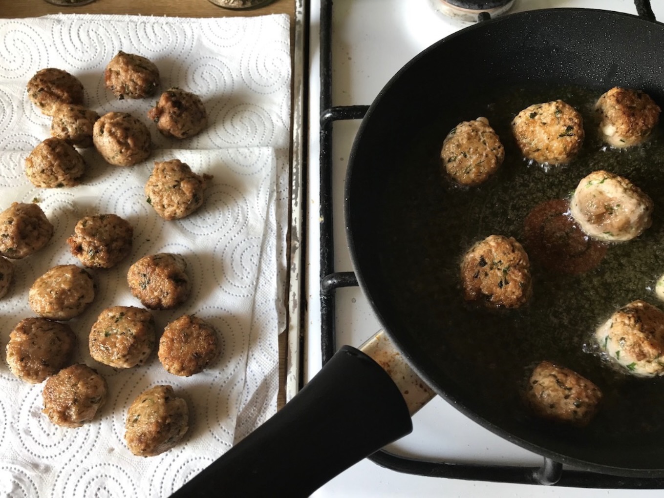 Formowanie i smażenie klopsów: Wyjmij masę łososiową z lodówki i uformuj klopsy wielkości piłki golfowej lub mniejsze. Smaż klopsy na oleju arachidowym przez 2 minuty, nie dłużej – łosoś dojdzie bardzo szybko i pozostanie soczysty.