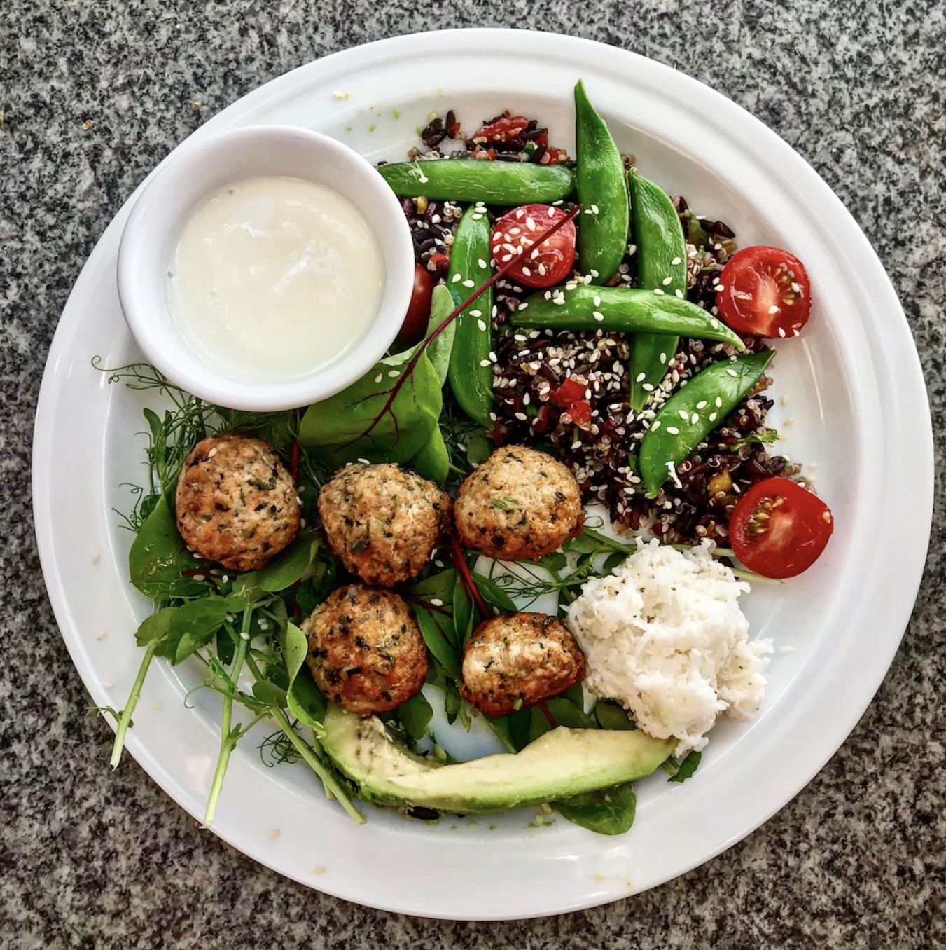 Sposób podania: Na talerzu rozłóż zioła, a na nich ułóż klopsy z łososia. Obok rozłóż dziki ryż z warzywami, groszek cukrowy i pomidorki koktajlowe. Całość posyp białym sezamem. Jako dopełnienie możesz dodać kawałek awokado, surówkę z białej rzodkwi i jogurtowy dip z dodatkiem świeżo wyciśniętego soku z limonki.