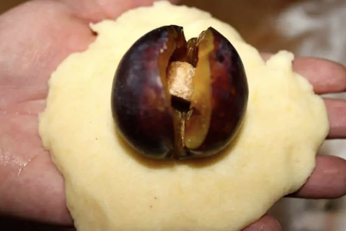 Do każdej śliwki włóż kostkę cukru trzcinowego, połóż owoc na cieście i uformuj okrągłą kluskę.