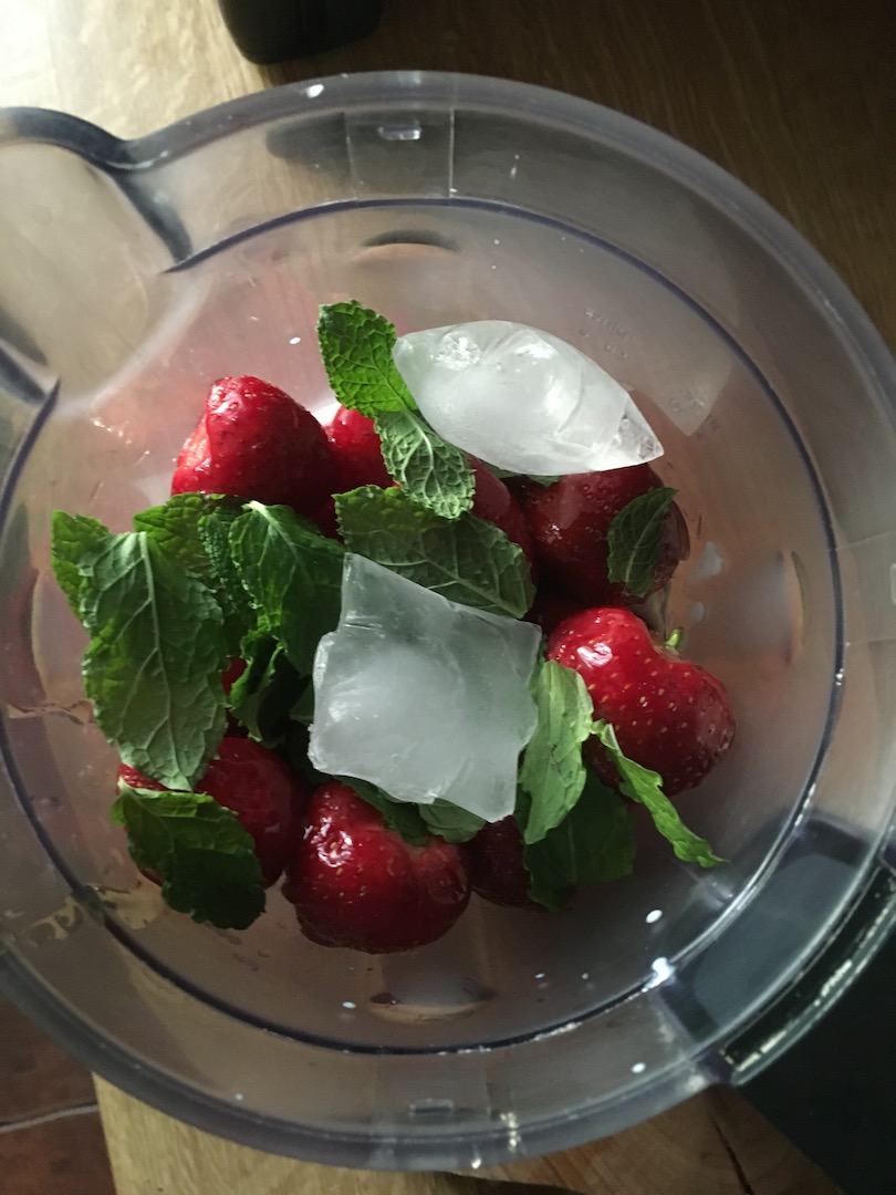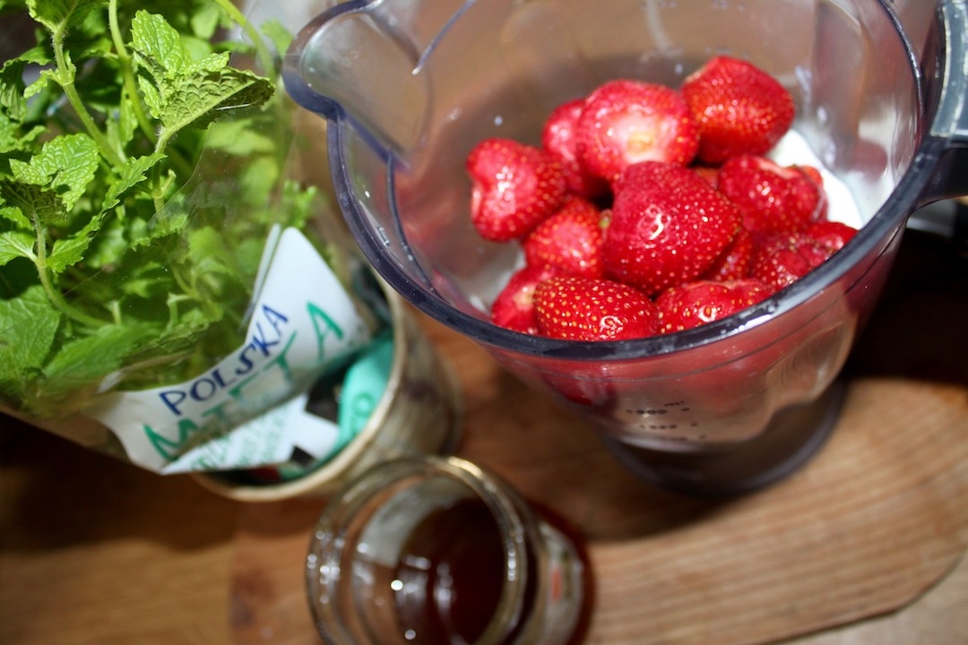 Blendowanie: Do naczynia miksującego wlej kefir, dodaj umyte i oczyszczone truskawki, liście świeżej mięty oraz miód.