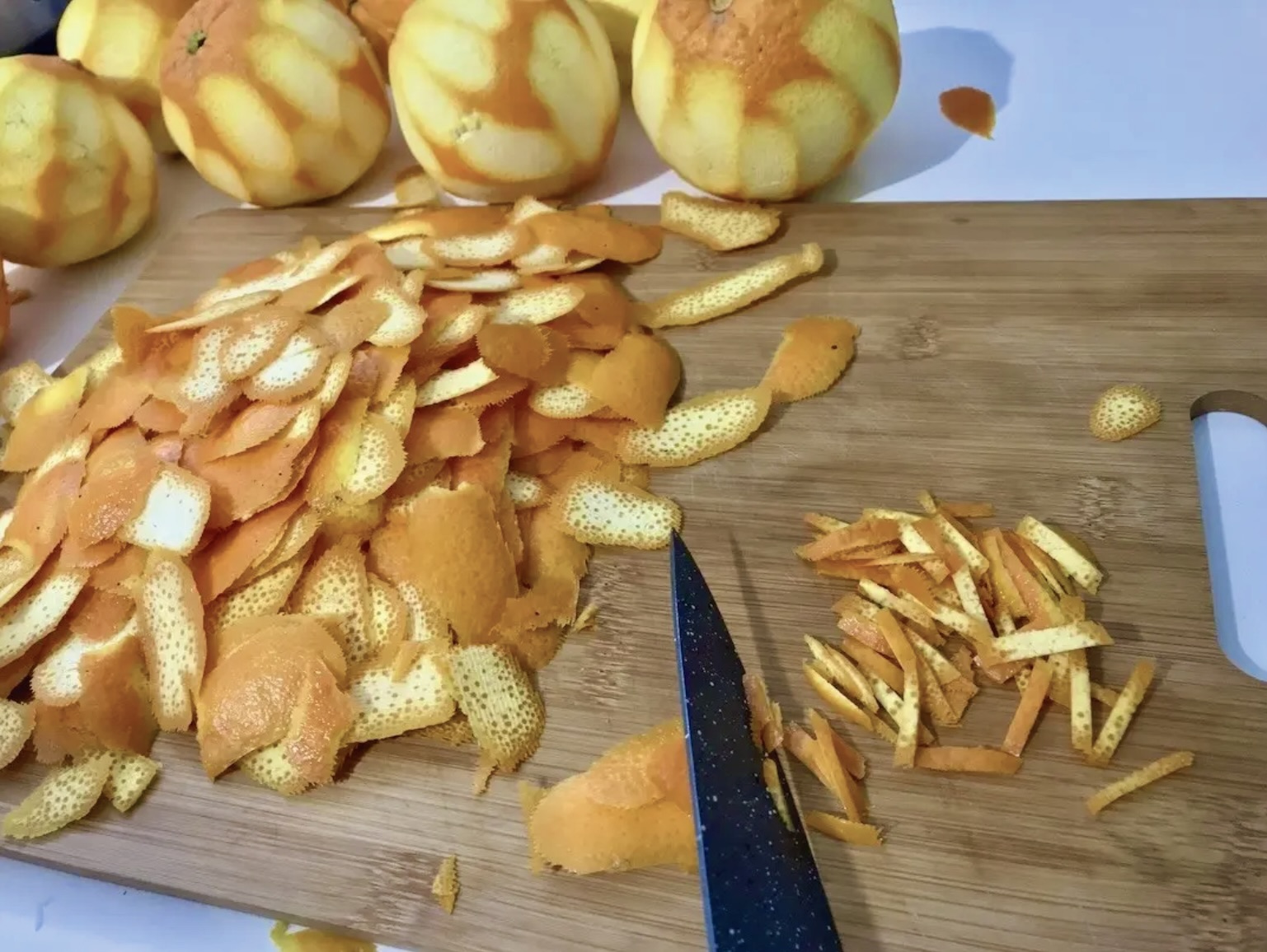 Obieraczką do warzyw zestrugaj jak najcieńszą skórkę (bez albedo – białej części) z pomarańczy.
