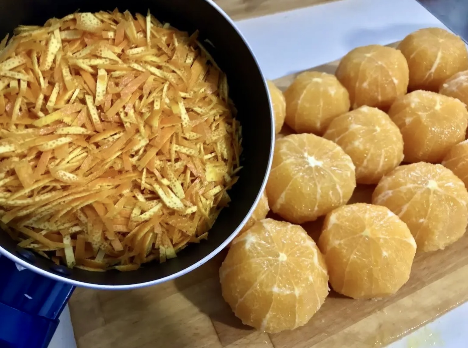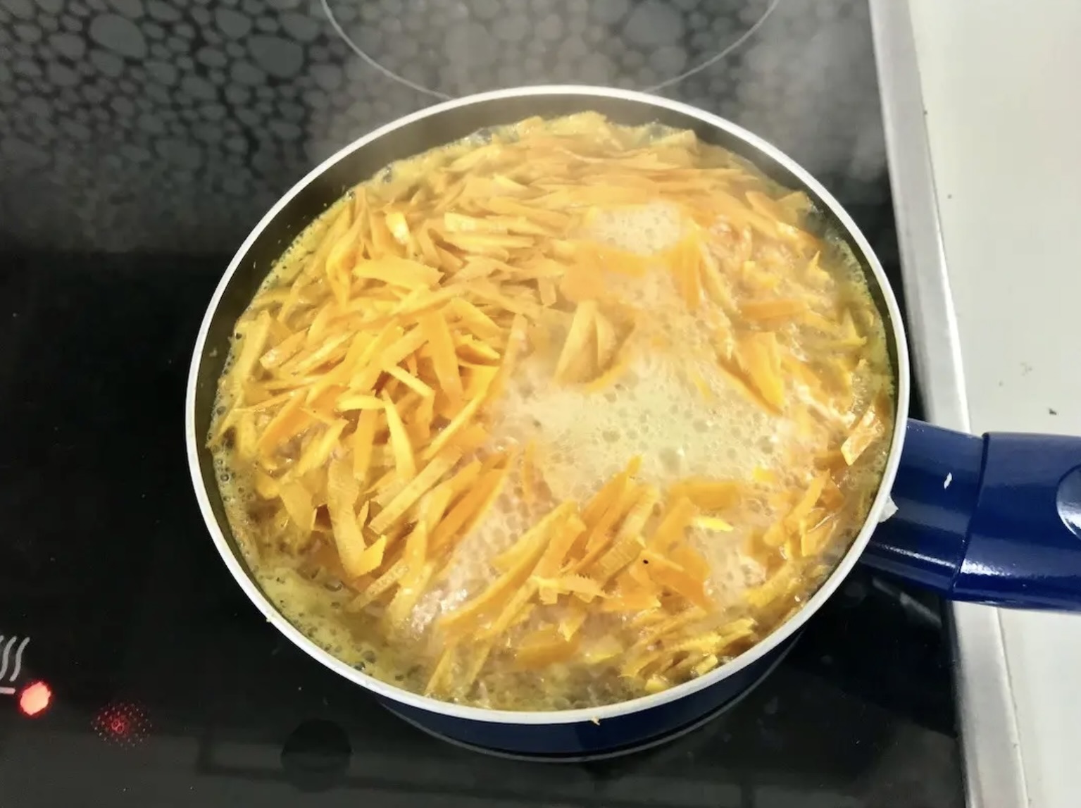 Umieść pokrojoną skórkę w garnuszku, a następnie zalej zimną wodą. Zagotuj, odcedź, a następnie powtórz tę czynność jeszcze dwa razy (gotowanie i odcedzanie łącznie 3 razy). Ostatni raz odcedź skórki.