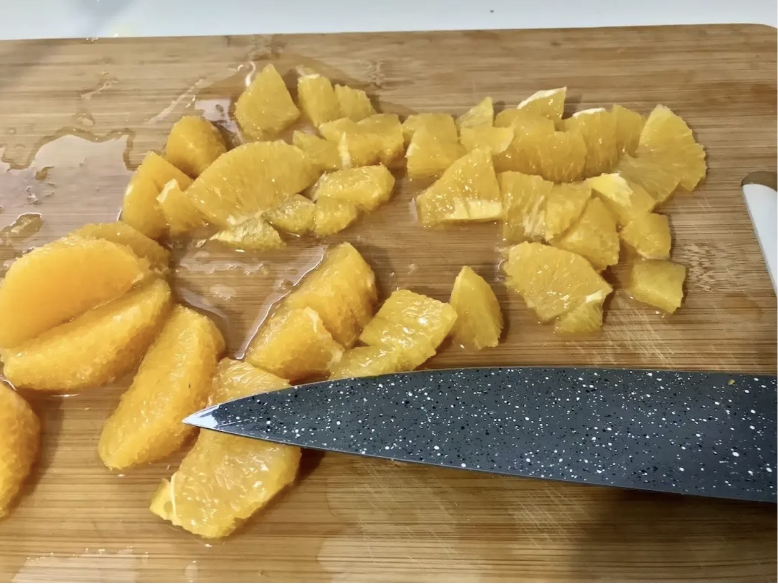 Wycinaj fileciki z pomarańczy, a następnie pokrój je na mniejsze kawałki.
