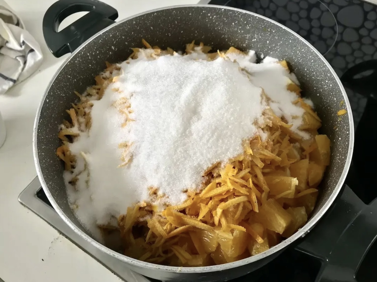 Kawałki pomarańczy, przegotowane skórki, cukier i szklankę wody umieść w dużym garnku.