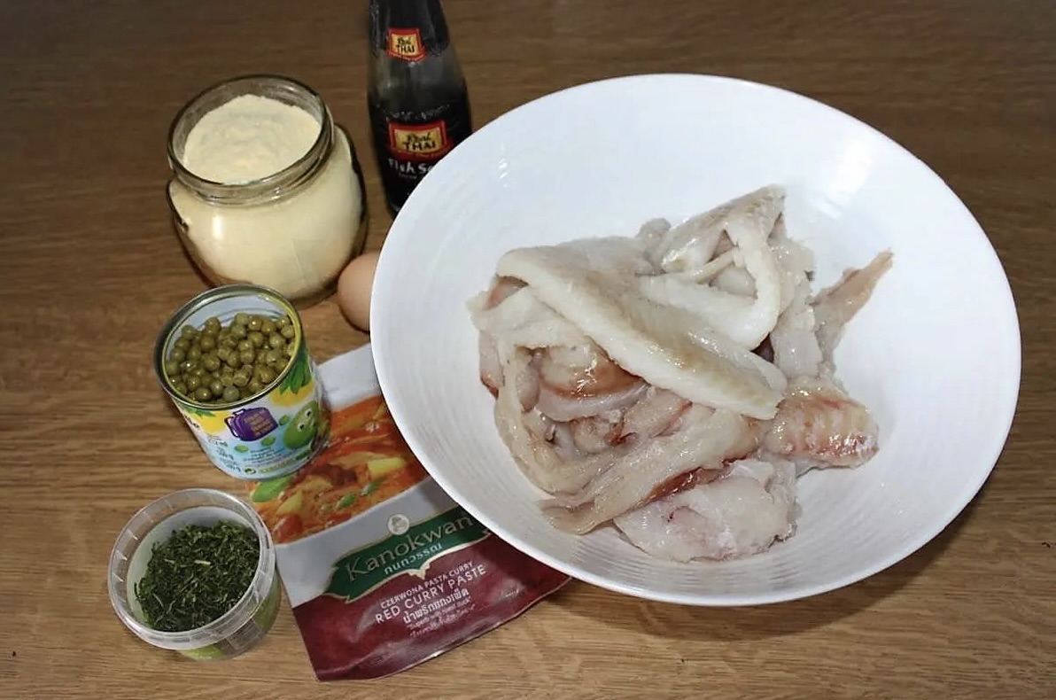 Przyprawy i sosy: 1-2 łyżeczki czerwonej pasty curry (zależnie od preferowanej ostrości), 2 łyżki sosu rybnego, 1-2 łyżki sosu sojowego, 2 łyżeczki suszonych liści limonki kaffir, pieprz;