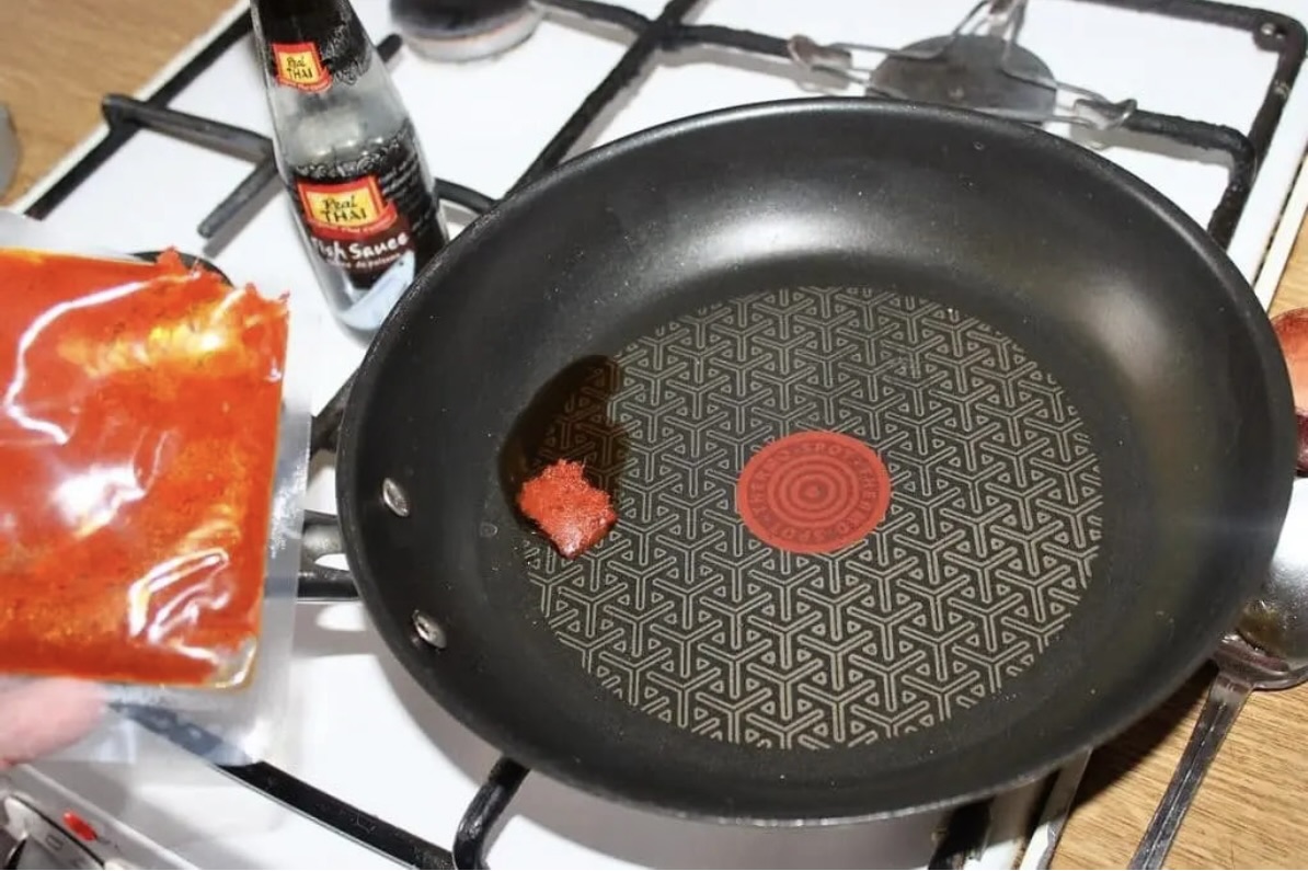 Baza smakowa: Na małej patelni rozgrzej sos rybny i rozpuść w nim czerwoną pastę curry.