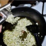 Smażenie dodatków: Na patelni rozgrzej nieco oliwy i zeszklij na niej posiekaną w drobną kostkę cebulę. Na koniec dodaj zmiażdżony czosnek i przesmaż z cebulą kilkadziesiąt sekund.