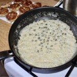 Przygotowanie sosu kaparowego: Na patelni rozgrzej nieco oliwy i masło. Wrzuć kapary (jeżeli są duże, przesiekaj je, małe pozostaw w całości). Smaż kapary około 1-2 minut, po czym wlej wino. Podkręć gaz i odparuj alkohol. Następnie wlej na patelnię wywar jarzynowy, a także słodką śmietankę. Całość lekko posól (uważaj, bo kapary są już dość słone) i posyp świeżo zmielonym pieprzem. Odparowuj sos na średnim ogniu przez kilka minut, aż zgęstnieje.