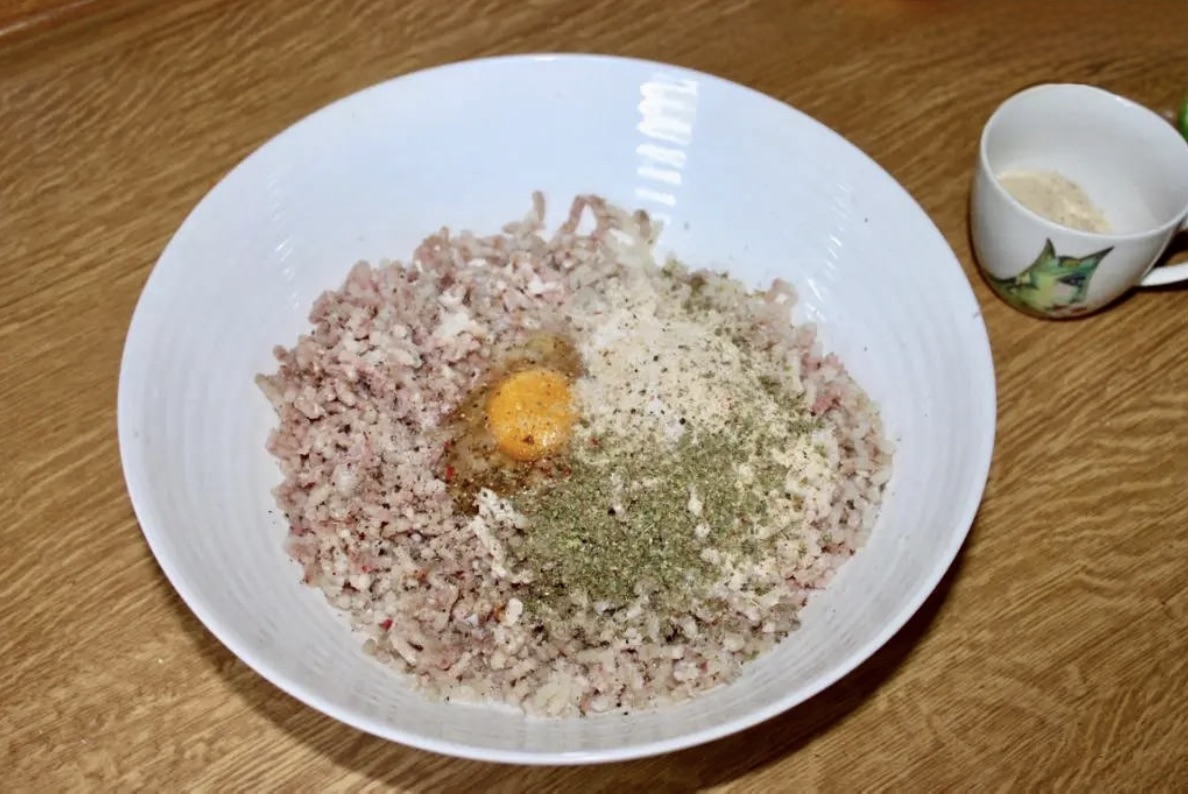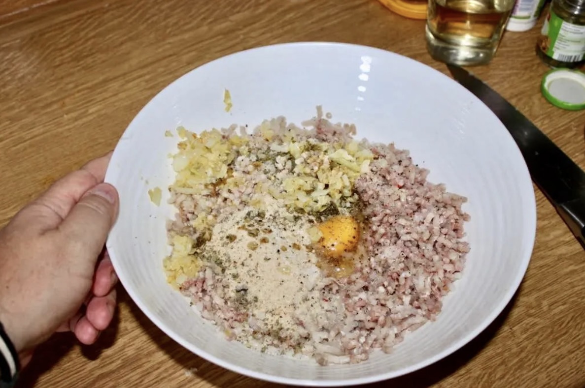Łączenie składników i chłodzenie: Przesmażoną cebulę i czosnek wrzuć do miski z pozostałymi składnikami (zmielona ryba, boczek, jajko, przyprawy, bułka tarta). Wymieszaj wszystko na jednolitą masę, doprawiając w razie potrzeby. Masę rybną przełóż do małej miski, owiń folią spożywczą i wstaw do lodówki na czas przygotowania sosu.