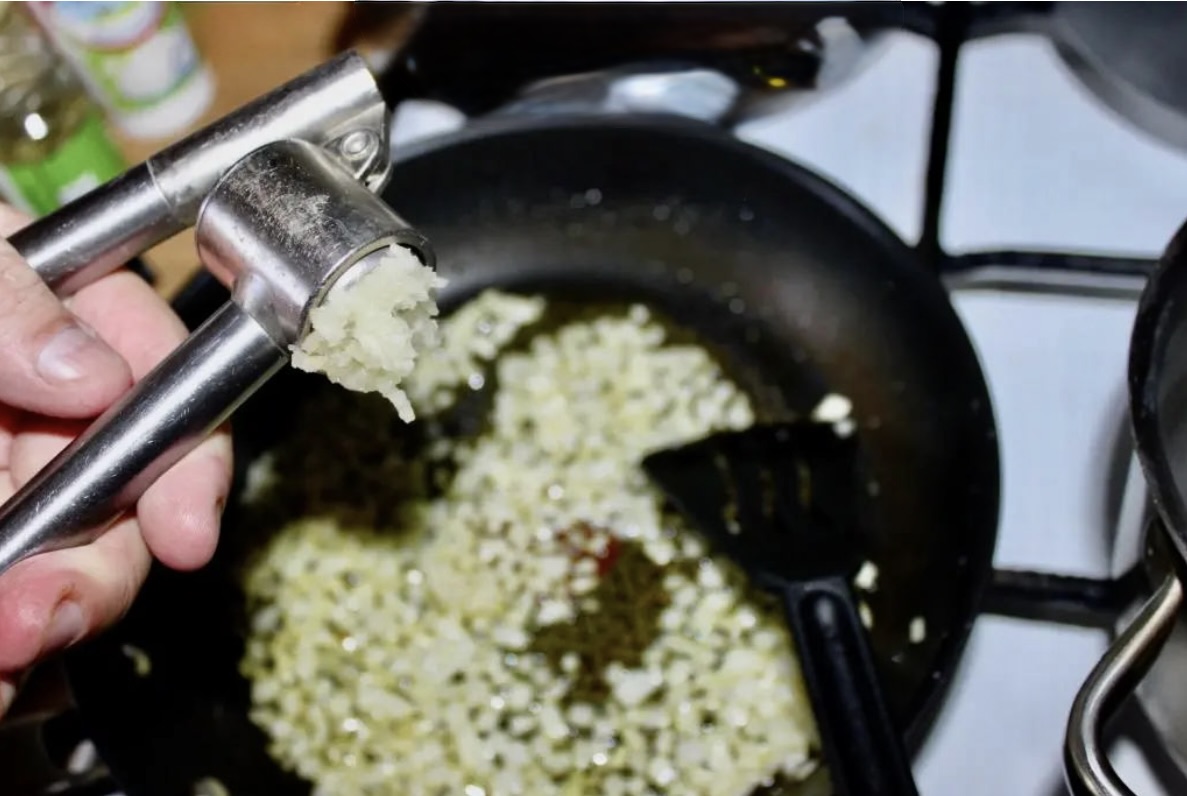 Smażenie dodatków: Na patelni rozgrzej nieco oliwy i zeszklij na niej posiekaną w drobną kostkę cebulę. Na koniec dodaj zmiażdżony czosnek i przesmaż z cebulą kilkadziesiąt sekund.
