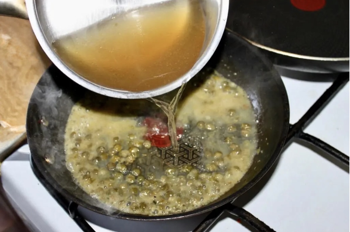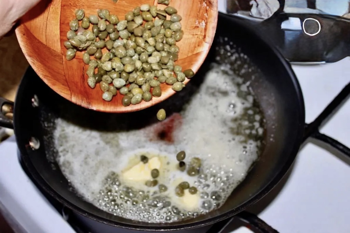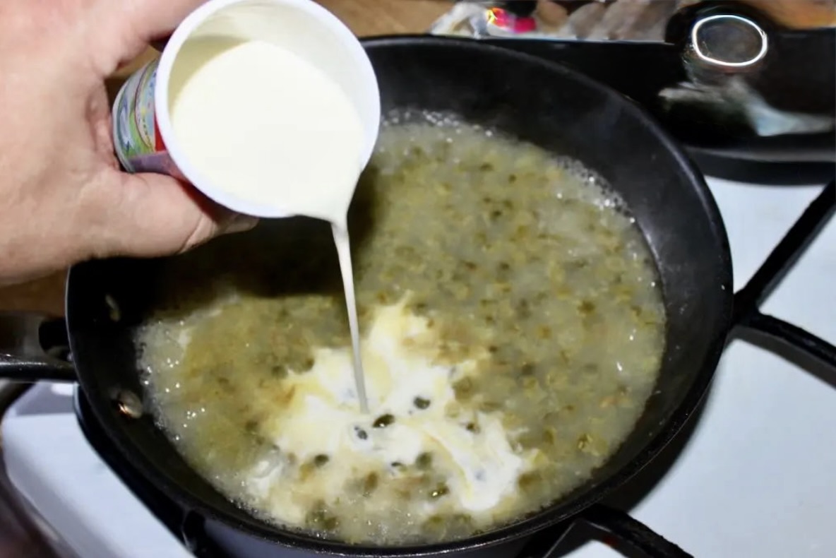 Przygotowanie sosu kaparowego: Na patelni rozgrzej nieco oliwy i masło. Wrzuć kapary (jeżeli są duże, przesiekaj je, małe pozostaw w całości). Smaż kapary około 1-2 minut, po czym wlej wino. Podkręć gaz i odparuj alkohol. Następnie wlej na patelnię wywar jarzynowy, a także słodką śmietankę. Całość lekko posól (uważaj, bo kapary są już dość słone) i posyp świeżo zmielonym pieprzem. Odparowuj sos na średnim ogniu przez kilka minut, aż zgęstnieje.