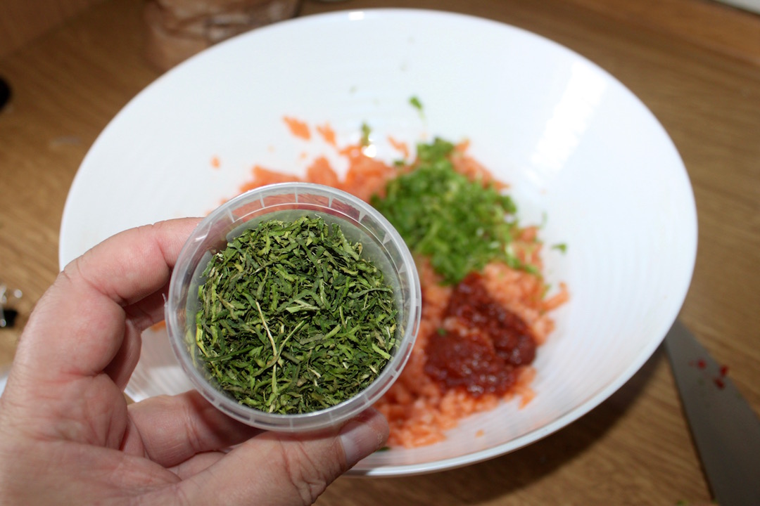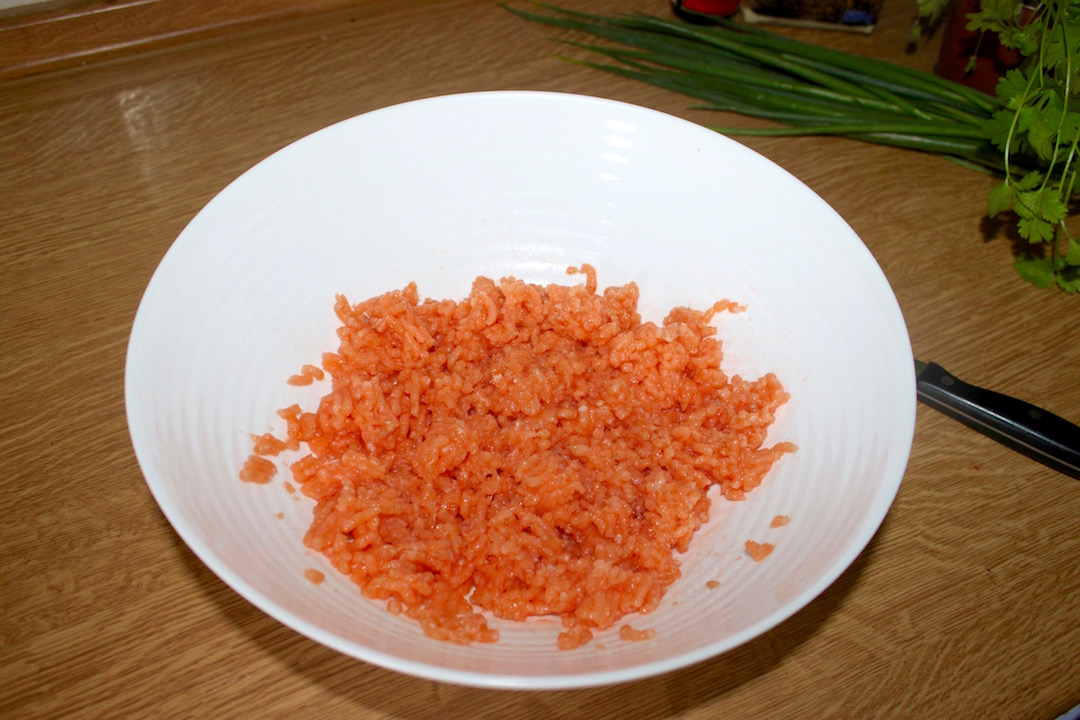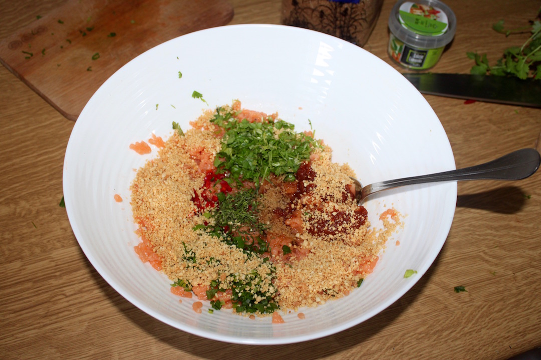 Przygotowanie ryby: Łososia pokrój na mniejsze kawałki i zmiel w maszynce, malakserze lub bardzo drobno posiekaj nożem (jak na tatara).