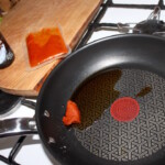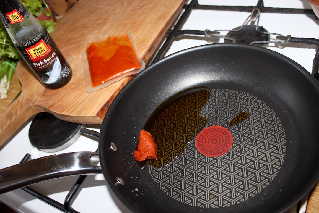 Aromatyzowanie pasty: Na małej patelni podgrzej 2 łyżki sosu rybnego z 1 łyżeczką czerwonej pasty curry. Mieszaj chwilę, aż pasta się rozpuści i uwolni aromaty, a następnie dodaj ją do miski z łososiem.