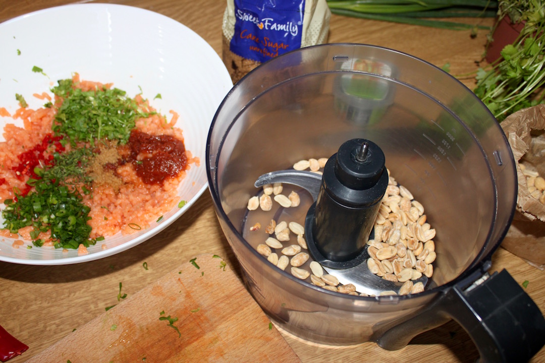 Orzeszki ziemne utłucz w moździerzu lub zmiel w malakserze i również dodaj do masy.