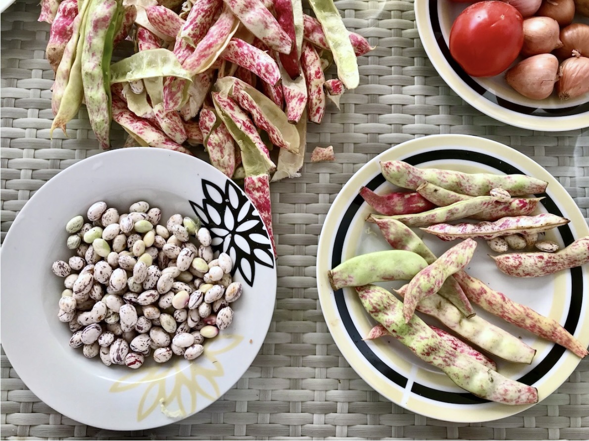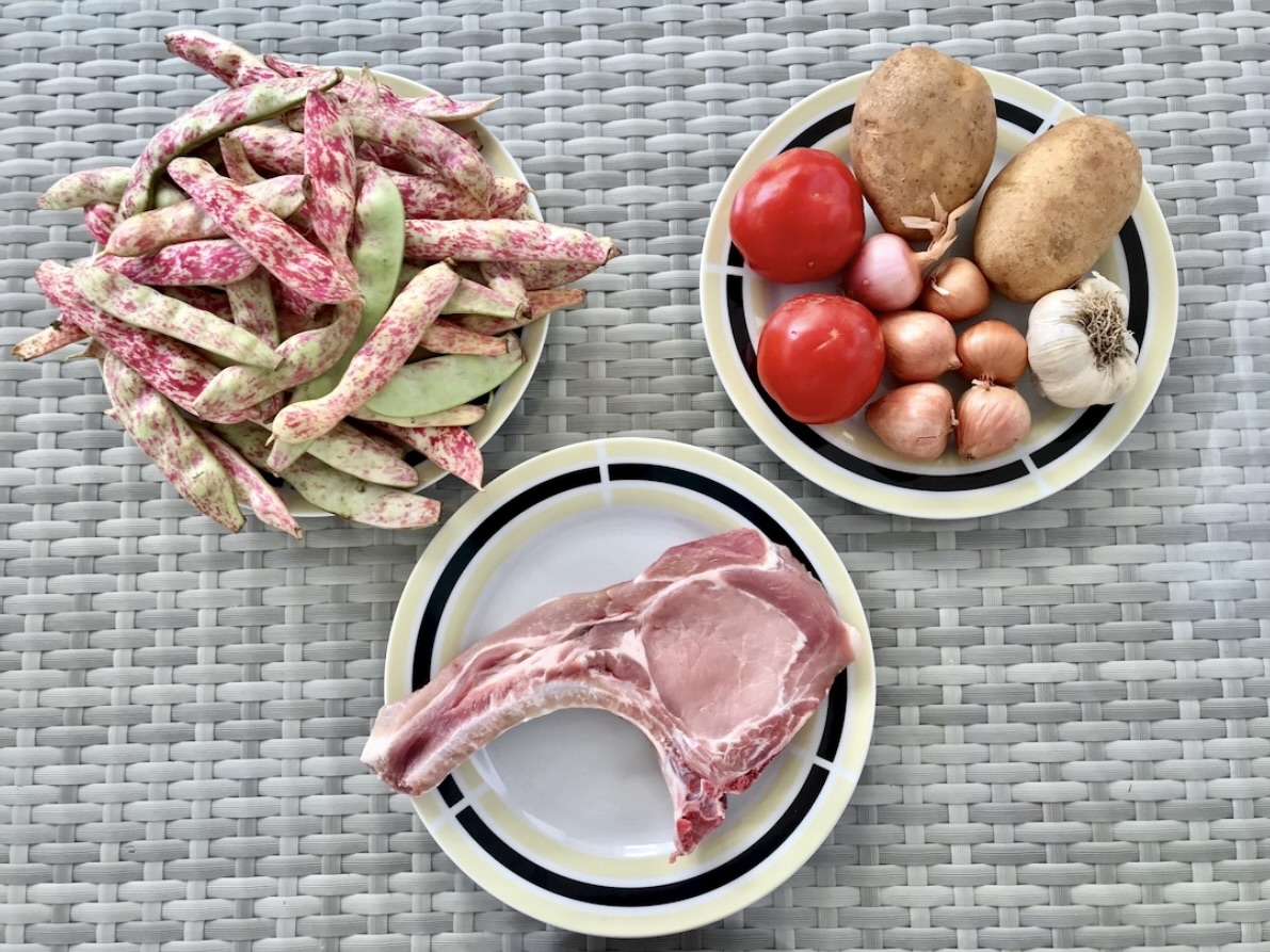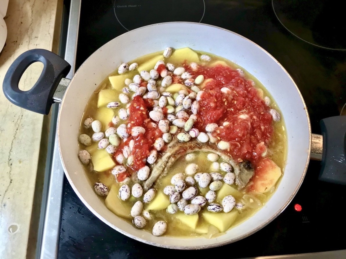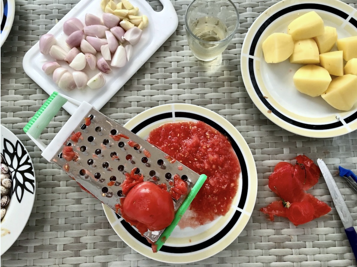 Przygotowanie warzyw: Obierz szalotki i ziemniaki. Czosnek posiekaj grubo. Pomidory zetrzyj na tarce o grubych oczkach. Jeśli używasz świeżej fasoli, wyłuskaj ją.