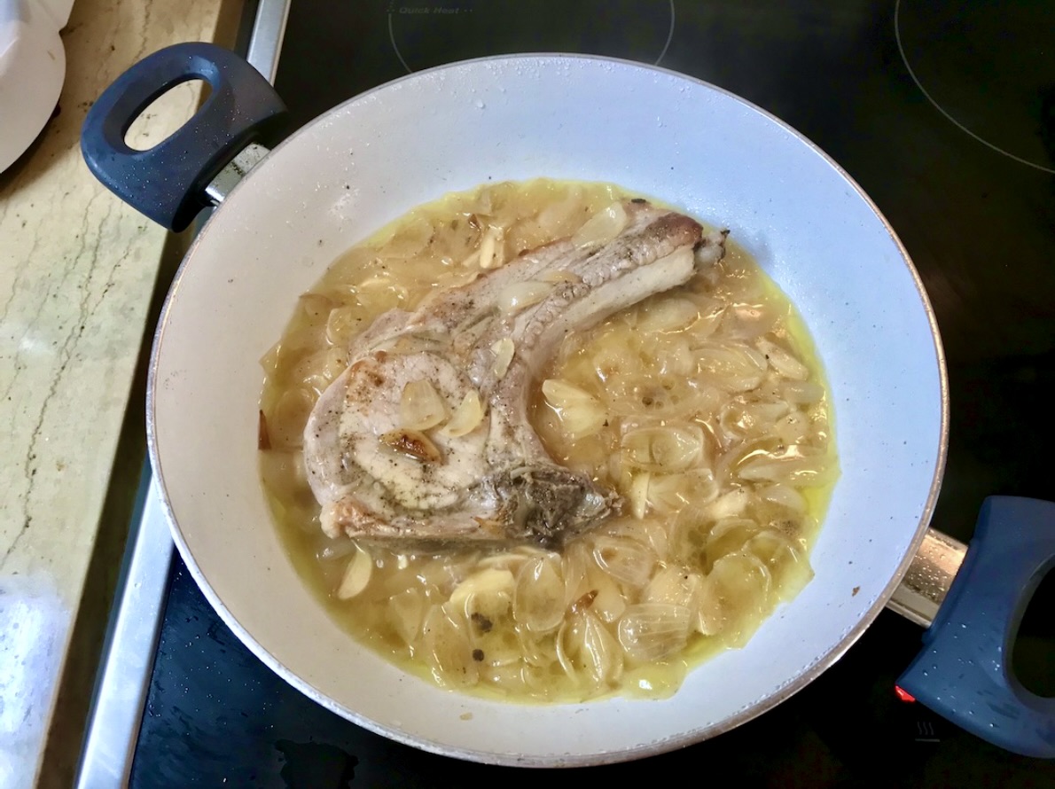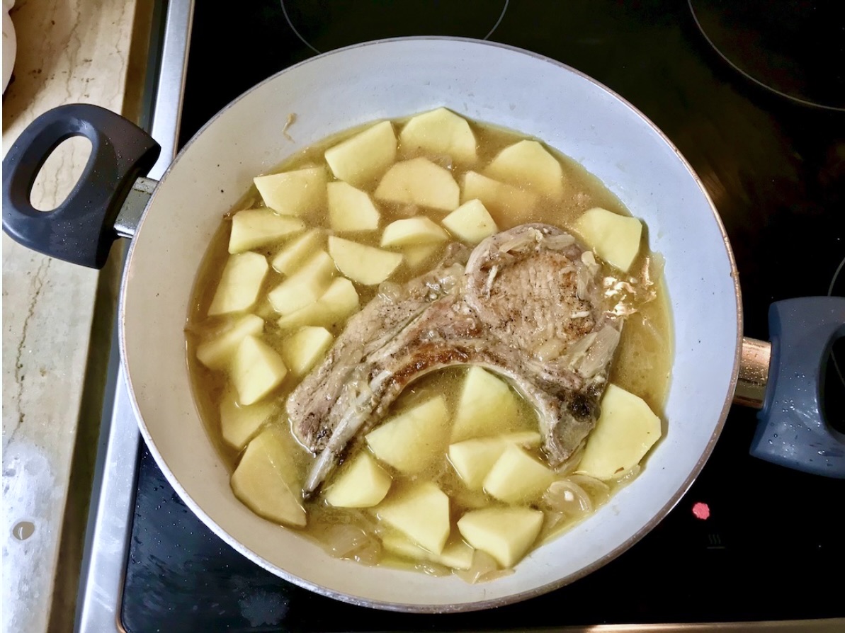 Duszenie (etap 1): Wlej na patelnię szklankę gorącej wody, przykryj, a następnie duś na małym ogniu przez 30 minut. Po tym czasie obróć kotlet na drugą stronę i duś kolejne 15 minut (w razie potrzeby dolej odrobinę wody).