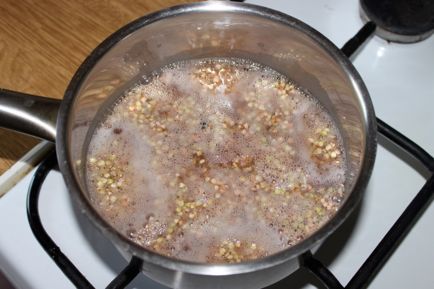 Przygotowanie kaszy: 100 g kaszy gryczanej wsyp do garnka, zalej 250 ml wrzącej wody i gotuj, aż woda prawie całkowicie odparuje. Zgaś gaz, przykryj garnek i zostaw kaszę, aby napęczniała i zmiękła.