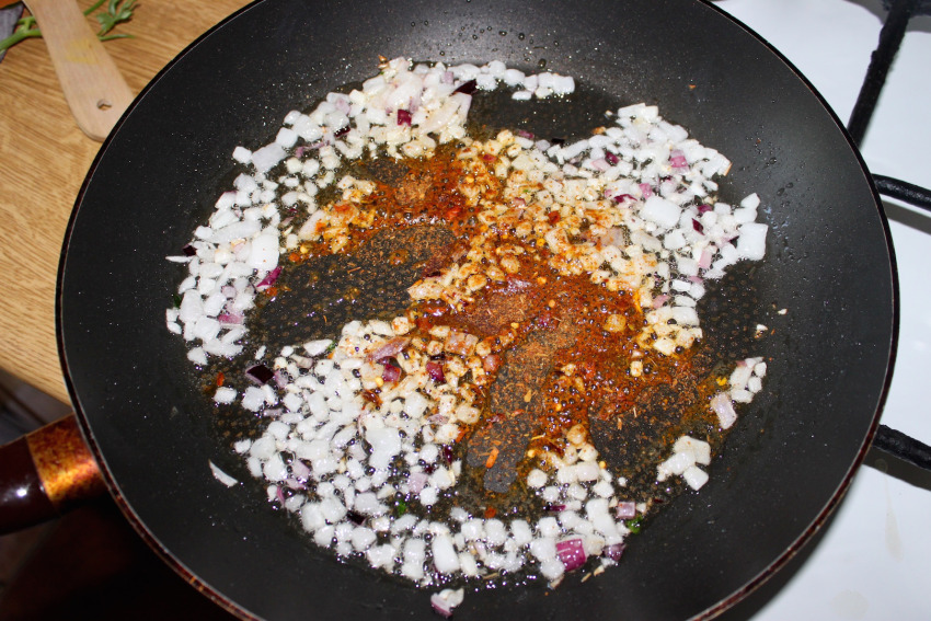 Smażenie dodatków: Na patelni rozgrzej nieco oliwy. Wrzuć cebulę i zeszklij ją. Następnie dodaj zmiażdżony czosnek i łyżeczkę ulubionej przyprawy. Smaż krótko (nie dłużej niż 30 sekund), mieszając.