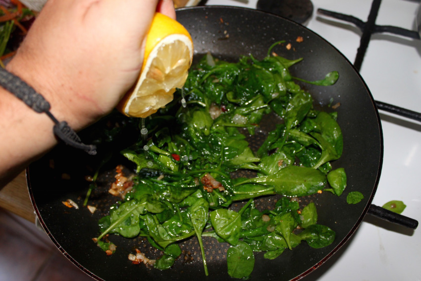 Szpinak: Wrzuć szpinak na patelnię, a gdy „zwiędnie”, wyciśnij na patelnię sok z połowy cytryny. Odstaw patelnię na bok.