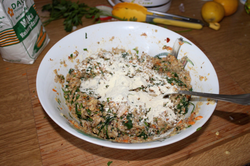 Łączenie składników: Do dużej miski wrzuć zmieloną ciecierzycę, startą marchewkę, posiekaną natkę pietruszki, posiekanego ugotowanego kurczaka oraz szpinak z patelni. Dodaj ugotowaną kaszę i 1-2 łyżki mąki kukurydzianej. Dopraw do smaku solą i pieprzem, a następnie dokładnie wymieszaj.
