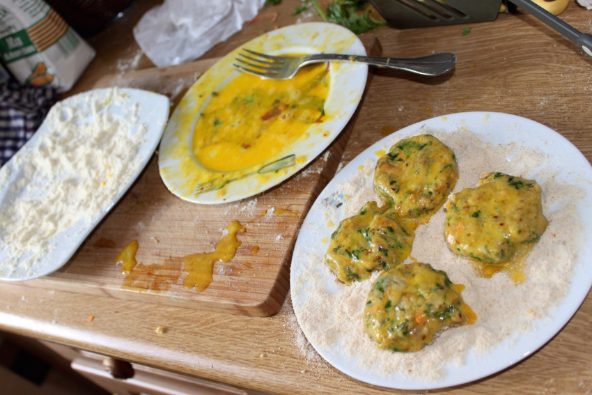 Formowanie i panierowanie: Formuj małe kotlety i obtaczaj je kolejno w mące pszennej, roztrzepanym jajku i bułce tartej (panierowanie sprawia, że kotlety są bardziej chrupiące).