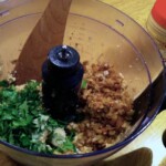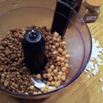 Miksowanie: Zawartość patelni przełóż do miski malaksera z warzywami strączkowymi. Dodaj 2 łyżki pasty tahini i garść posiekanej natki pietruszki. Całość krótko zmiksuj.