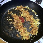 Smażenie aromatyczne: Obierz i posiekaj czosnek i cebulę. Rozgrzej lekko patelnię z oliwą, wrzuć cebulę, czosnek, kmin rzymski i ostrą, mieloną paprykę. Smaż około 30 sekund na średnim ogniu.