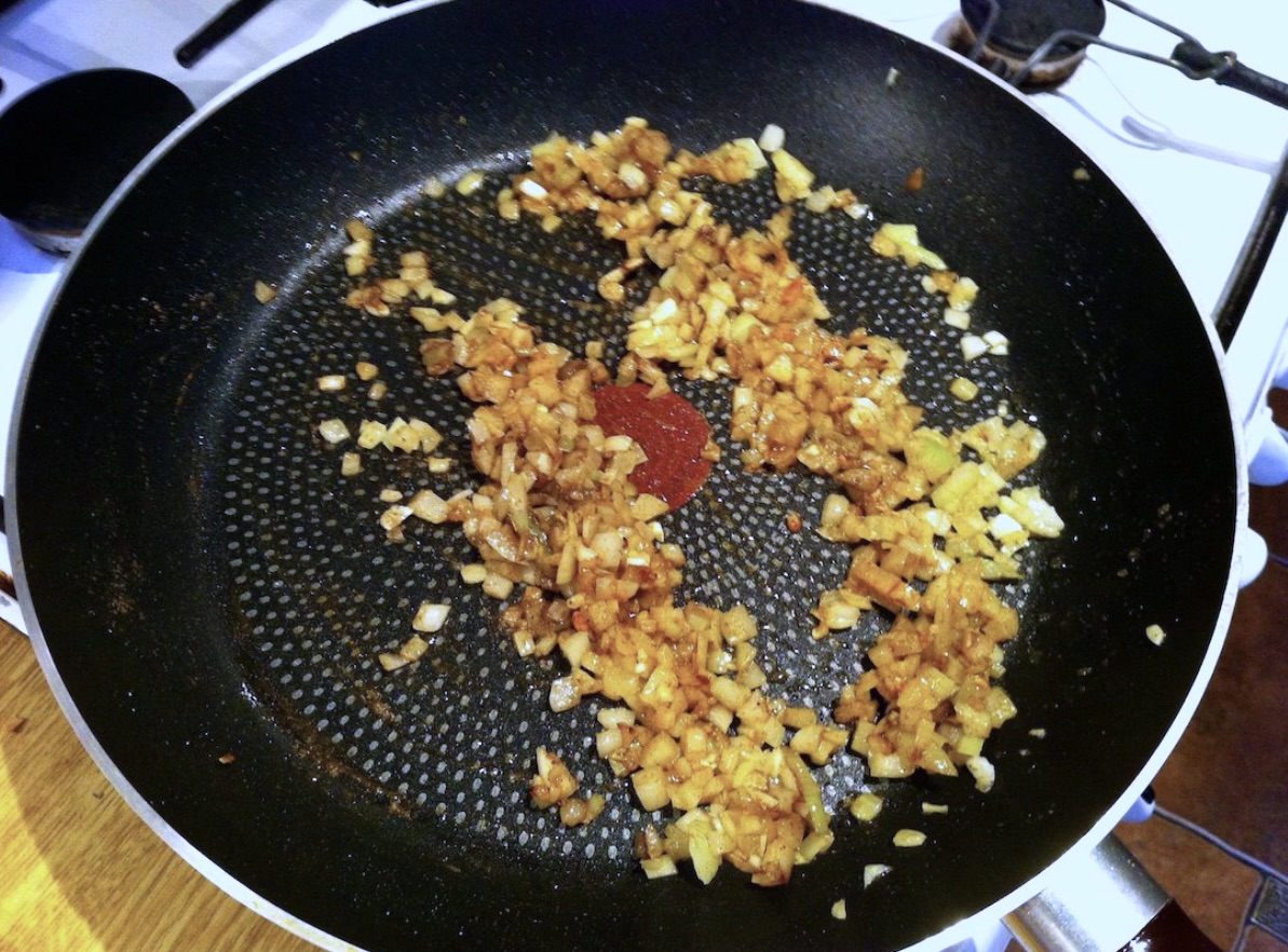 Smażenie aromatyczne: Obierz i posiekaj czosnek i cebulę. Rozgrzej lekko patelnię z oliwą, wrzuć cebulę, czosnek, kmin rzymski i ostrą, mieloną paprykę. Smaż około 30 sekund na średnim ogniu.