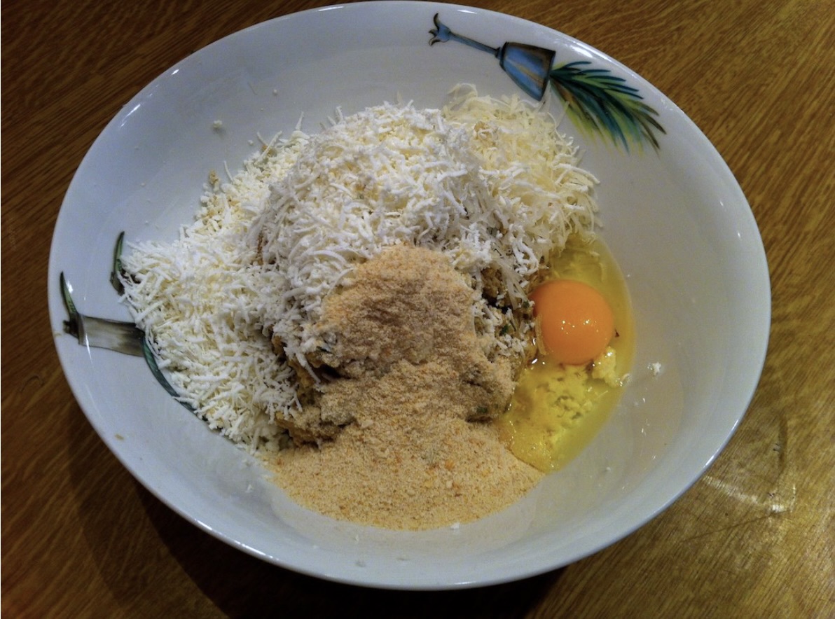 Wyrabianie masy: Uzyskaną masę przełóż do dużej miski. Wbij jajko, dodaj bułkę tartą oraz około 100 g startego sera (np. mieszankę fety i parmezanu).
